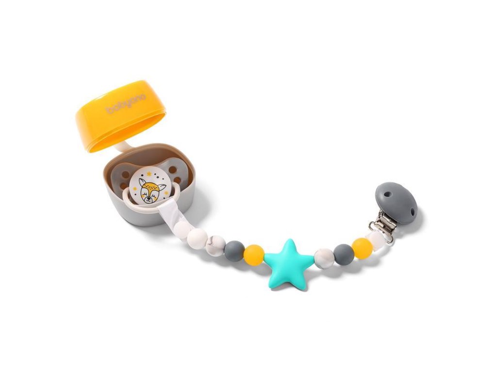Puzdro na cumlík je praktickým pomocníkom pre rodičov. Chráni cumlík dieťatka pred nečistotami, ľahko sa používa. Elastický uzáver umožňuje pripevniť puzdro na kočík, autosedačku alebo prebaľovaciu tašku. Vyrobené z bezpečných materiálov. Do puzdra sa vojdú 2 cumlíky. Vlastnosti: - ochrana pred znečistením cumlíkov - pojme 2 cumlíky - vďaka elastickému úzáveru ho môžete pripevniť ku kočíku, autosedačke alebo k prebaľovacej taške - neobsahuje bisfenol A Rozmer produktu: 5,5 cm x 5 cm Výrobok je potrebné skontrolovať pred každým použitím. Ak sa objavia prvé známky poškodenia alebo opotrebenia, vyhoďte ho. Vždy používajte pod dohľadom dospelej osoby. Výrobok nie je hračka. Odporúčame uchovať obal na informačné účely. Obal uchovávajte na mieste neprístupnom deťom. Adresa dodávateľa: Babyono sp. z o.o., Kowalewicka 13, 60-002 Poznań, Poland. +48 61 83 90 520, info@babyono.pl, www.babyono.comDodatočné parametre