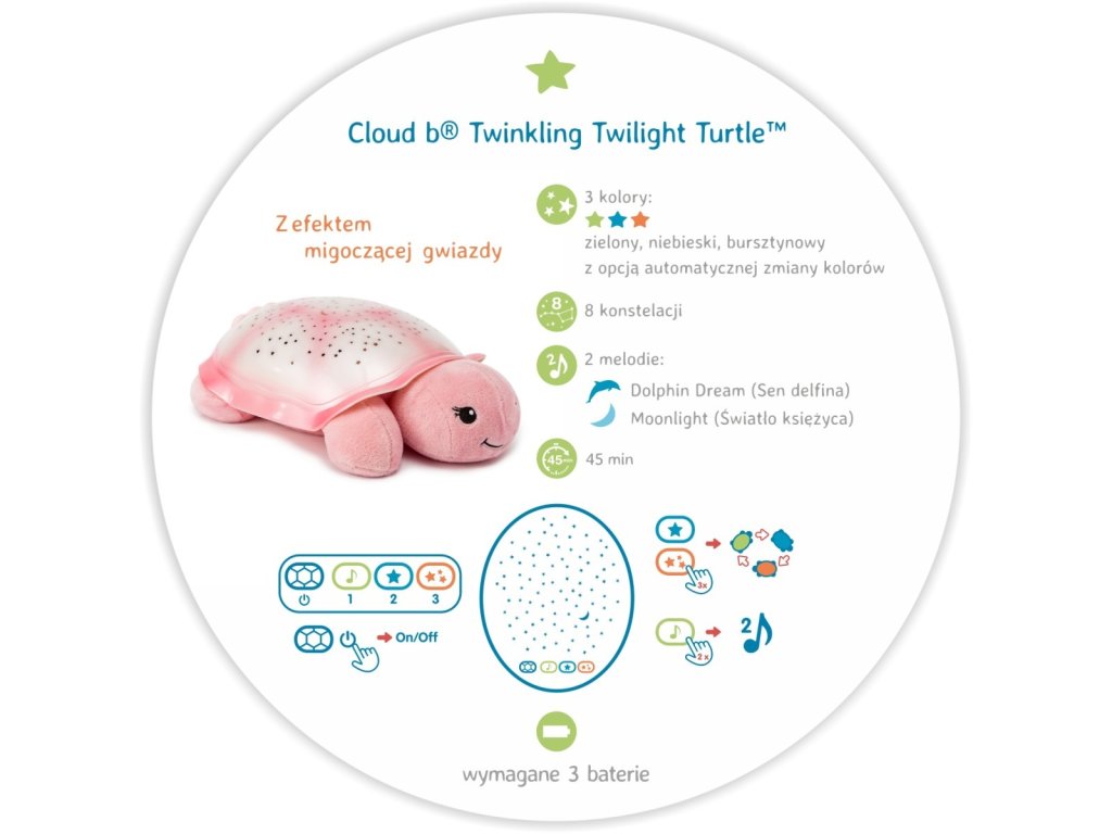 Cloud b® Twinkling Twilight Turtle™- Nočné svetielko s melódiou, Korytnačka, ružová, 0m+