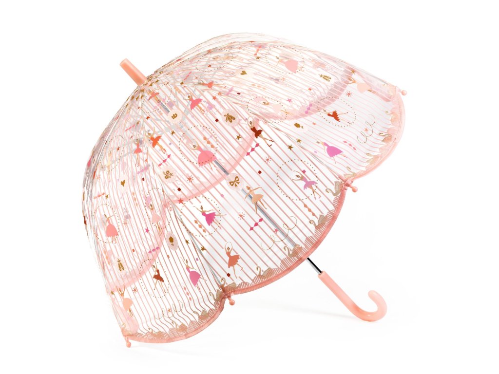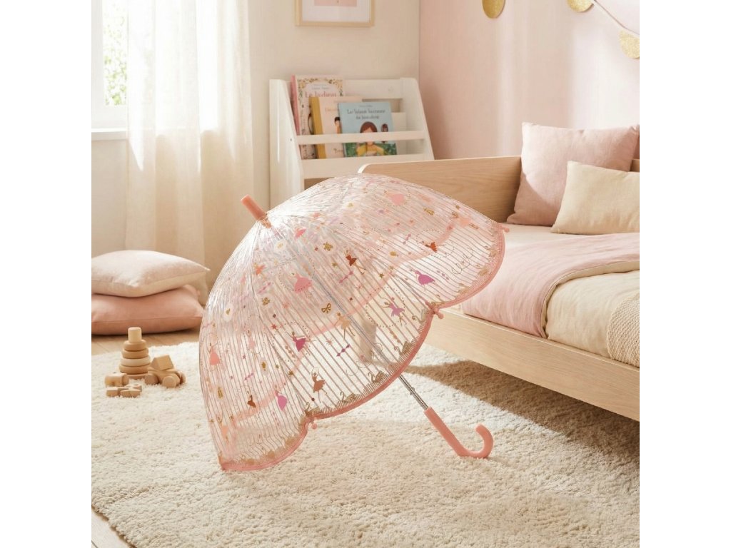 Detský dáždnik Balerína veľkosť M Jemný baletný motív do dažďa: priehľadný dáždnik, ktorý dieťaťu nebráni vo výhľadeDáždnik Balerína je krásny detský dáždnik s elegantnými ilustráciami baletiek, ktorý spríjemní každú daždivú prechádzku.Vďaka priehľadnej kupole dieťa dobre vidí pred seba, cíti sa istejšie a ľahšie sa orientuje v priestore. Dáždnik má manuálne otváranie s ochranným systémom, ktorý pomáha predchádzať privretiu prstov, a odolnú konštrukciu zo sklolaminátu – je pružná a zároveň pevná.Obsah balenia 1× priehľadný detský dáždnik s motívom balerínRýchly prehľad odporúčaný vek: od 3 rokov veľkosť: približne 68 × 70 cm (priemer cca 70 cm) konštrukcia: 8 rebier zo sklolaminátu (flexibilné a odolné) otváranie: manuálne, s ochranou proti privretiu prstov rukoväť: matná plastová povrch: priehľadný plast + textilná úprava/lemDodatočné parametre
