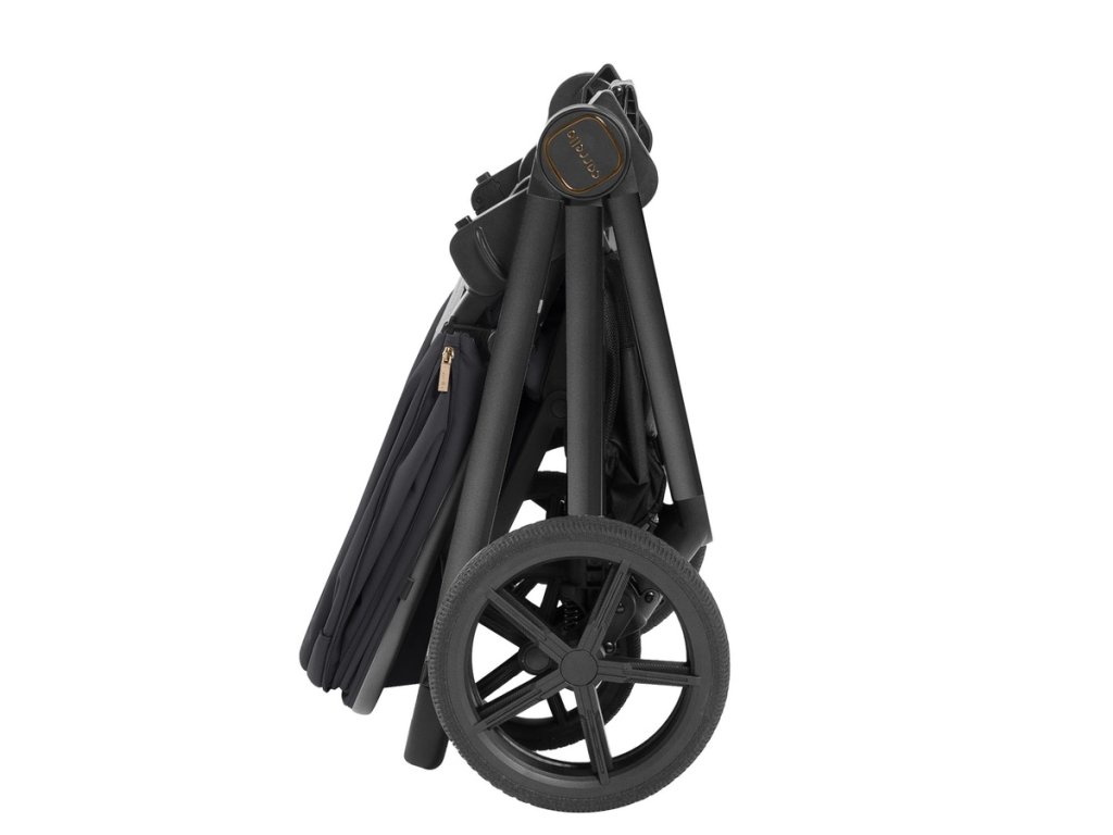 - Kolesá s veľkým priemerom a pneumatiky z inovatívneho penového polyuretánu s odolným dezénom zabezpečujú pohodlnú jazdu na nerovnom povrchu vo všetkých ročných obdobiach. Hladkú jazdu zabezpečuje odpruženie na každom kolese.
