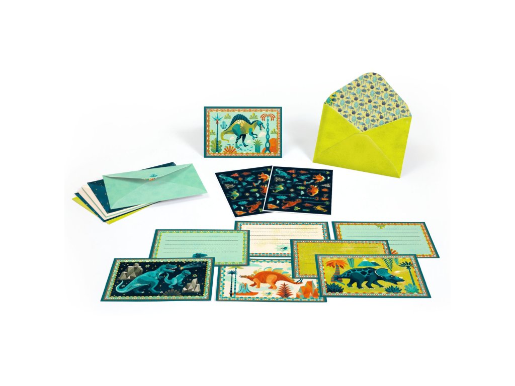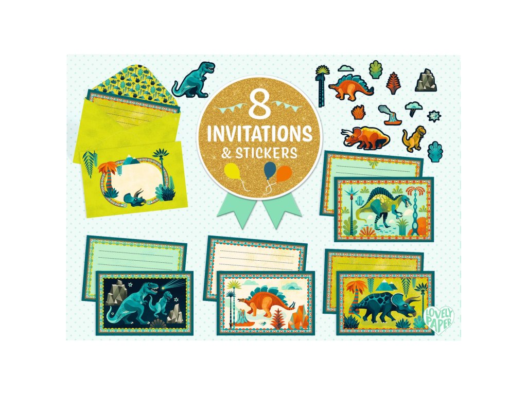 Pozvánky & samolepky DinosauryVeselá sada na oslavy a tvorenieDinosaury: 8 pozvánok a samolepiek je zábavná sada pre deti, ktorá obsahuje 8 farebných pozvánok, 8 ilustrovaných obálok a samolepky na ich ozdobenie. Sada je ideálna na narodeninové oslavy, tematické párty alebo na tvorivé aktivity. Dizajn má metalické detaily a matnú potlač.Prečo si vybrať sadu od Djeco8 pozvánoksamolepky na ozdobenieskvelé na oslavy a tvorivé hryObsah balenia8 kusov pozvánok s ilustráciami8 obálok2 hárky samolepiek na zdobenieDodatočné parametre
