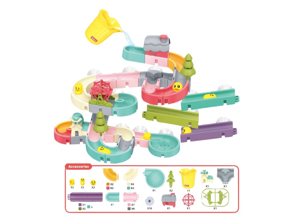 DIY Šmykľavka do vody 62 ksPodporte tvorivosť a predstavivosť vašich detíDIY Šmykľavka do vody 62 ks prináša deťom maximálne možnosti pre kreatívnu a zábavnú hru vo vode. Vďaka až 62 dielikom si môžu deti skladať vlastné šmykľavky a dráhy, sledovať pohyb guličiek či malých hračiek vo vode a vytvárať nekonečné kombinácie trás.Súčasťou balenia sú guličky, kačičky aj množstvo doplnkov, ako vodný mlyn, vodné koleso, stromy a domček, ktoré fungujú ako prekážky pre vodu a výrazne obohacujú herný zážitok. Deti môžu usmerňovať tok vody, meniť jej smer a sledovať, ako jednotlivé prvky ovplyvňujú pohyb po dráhe.Táto vodná stavebnica podporuje jemnú motoriku, logické myslenie, tvorivosť aj priestorovú predstavivosť. Šmykľavka je ideálna ako hra do vane, senzorických vaničiek aj na interaktívne aktivity doma či v škôlke. Jednoduché spojenie dielikov umožňuje rýchlo meniť konfigurácie a vytvárať stále nové, pestré vodné dobrodružstvá. Nevhodné pre deti do 3 rokov. Používať len pod priamym dohľadom dospelej osoby.Dodatočné parametre