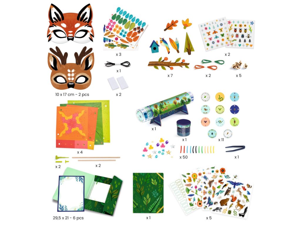 Príroda v strede záujmu! Sada 5 kreatívnych aktivít obsahuje všetko potrebné na zhotovenie 12 výtvorov, ktoré spája téma prírody. Vzniknú 2 zvieracie masky (hráme sa na zvieratá), 2 vrtuľky a 1 zvonkohra (hráme sa s vetrom), 6 plagátikov (vytvárame kategórie) a 1 kaleidoskop (pozorovanie je magická činnosť). Sada vystačí na hodiny kreatívnej zábavy a je vhodná aj pre skupinku detí.Papier a kartón použitý na výrobu sady má ekologický certifikát FSC®. Kolekcia Vytvor si sám (DIY) má blízko k úžitkovému umeniu a umožňuje deťom zhotoviť umelecké výrobky, ktoré si môžu nielen hrdo vystaviť, ale ich aj používať.Obsah: 2 masky na ozdobenie: 80 ks ilustrovaných papierových dielov, 2 hárky obojstranných lepiek, 2 elastické šnúrky (gumky); 2 vrtuľky na poskladanie: 4 hárky s vyrezanými ilustrovanými dielmi, 2 drevené paličky, 2 plastové koncovky (čiapočky); 1 kaleidoskop na poskladanie: 1 ilustrovaný tubus, násada s krytkou (plast) na vloženie farebných dielikov a kotúčov na pozorovanie, 3 zrkadlá (zrkadlová fólia), 1 okulár so šošovkou (plast a papier), 1 pinzetka, 11 ilustrovaných kotúčov, 50 ks farebných dielikov, škatuľka s vekom na uskladnenie dielikov a kotúčov, ilustrovaný stojan; 6 obrázkov (plagátov) s prírodnými motívmi na dotvorenie: 4 hárky samolepiek (zvieratká a rastlinky), 1 hárok samolepiacich menoviek, odkladacia mapa s gumičkou; 1 závesná dekorácia (zvonkohra) na ozdobenie: 2 hárky obtlačkov, 7 ilustrovaných dielov, 2 ks farebných šnúr, 5 zvončekov; 1 obrázkový návod pre každú aktivituDodatočné parametre