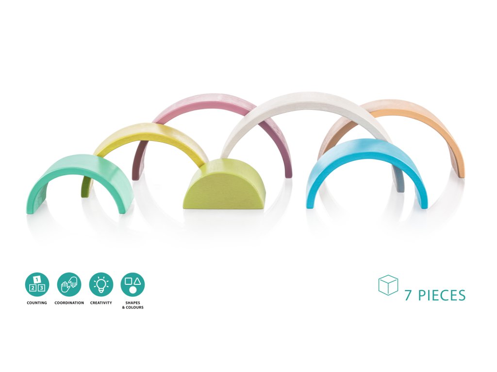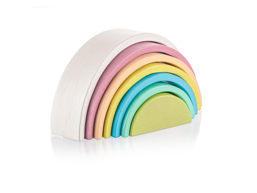 Drevená dúha v pastelových farbách. Vhodné pre deti od 18 mesiacov.