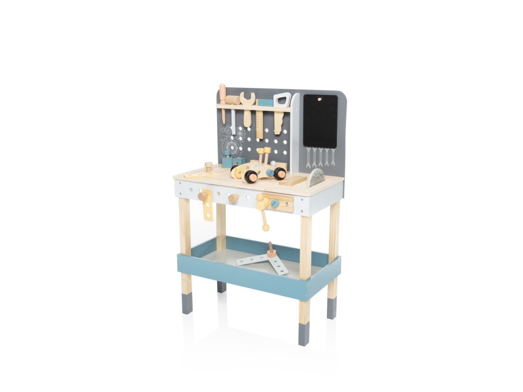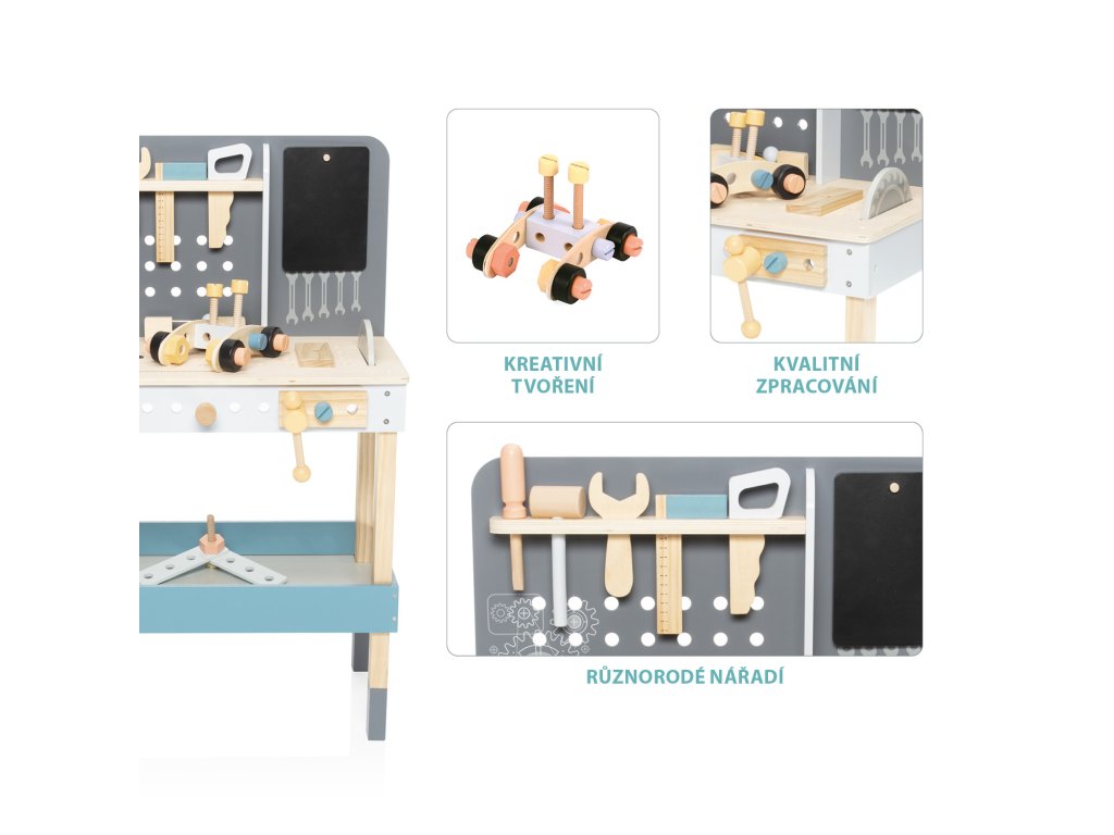 dreveného kladiva, meracieho pásu a píly. Ponk je vyrobený z kvalitného dreva a