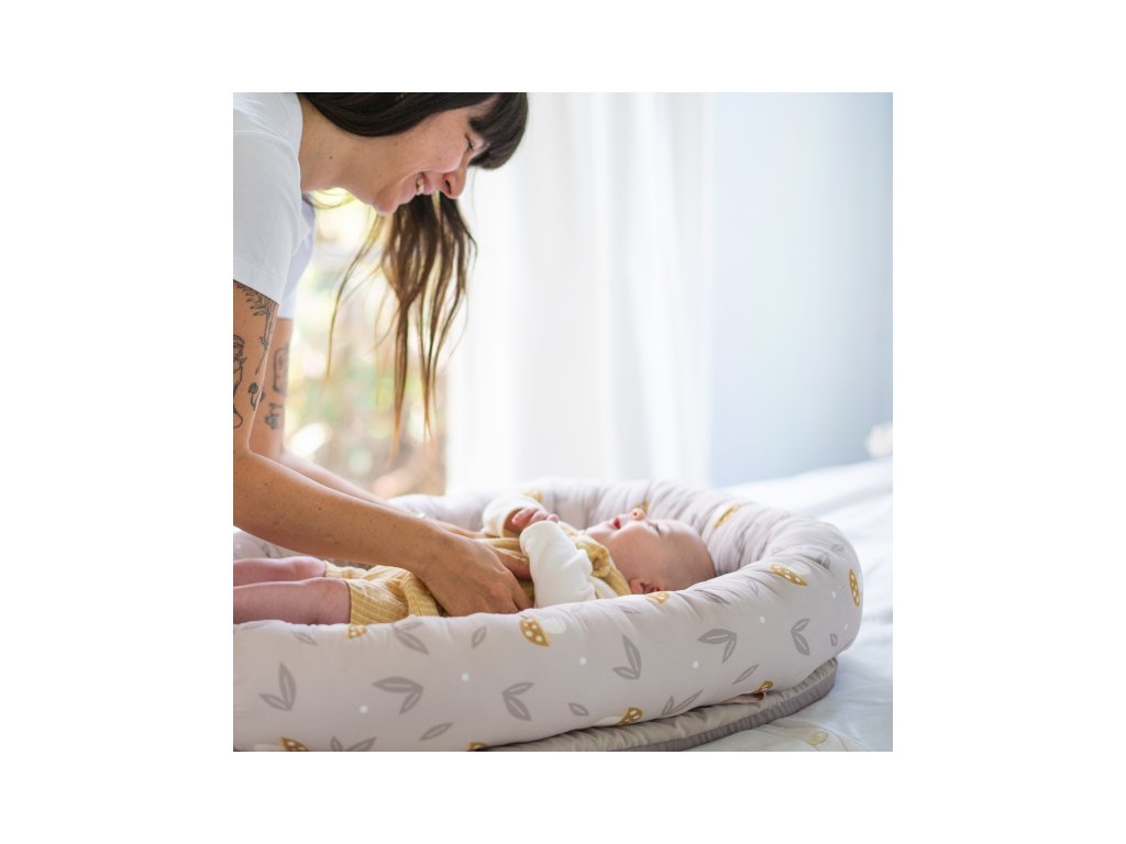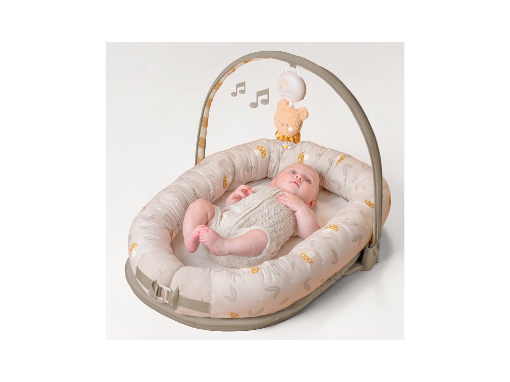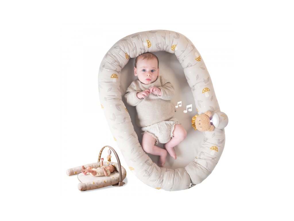 Hniezdo pre bábätko Taf Toys je praktický doplnok, ktorý rastie spolu s dieťaťom. V prvých týždňoch slúži ako mäkké, bezpečne obopínajúce hniezdo, v ktorom sa novorodenec lepšie upokojí a odpočíva. Od troch mesiacov veku dieťaťa je možné hniezdo rozložiť a využiť ako pohodlný priestor na hranie. Súčasťou odnímateľnej hrazdy je plyšový medvedík so svetielkami a 22 minútami upokojujúcich melódií, ktoré pomáhajú bábätko zabaviť aj upokojiť. Hudobný medvedík je použiteľný aj samostatne.