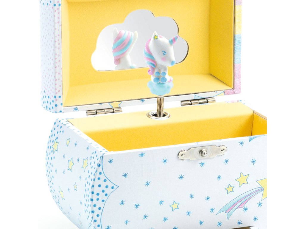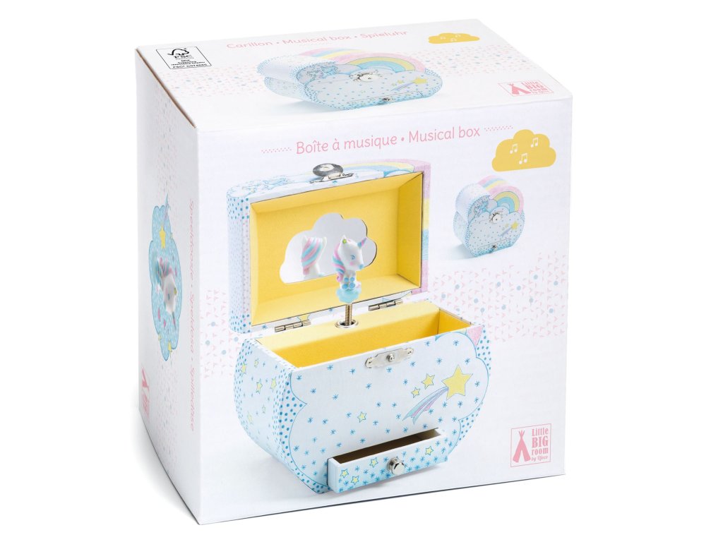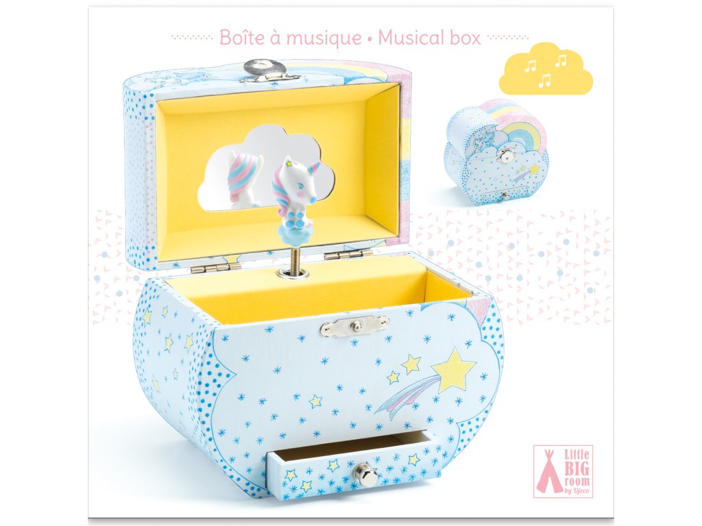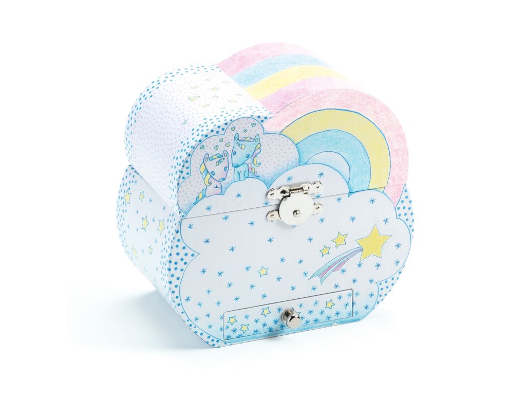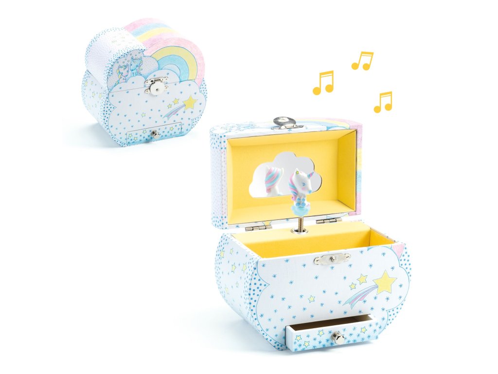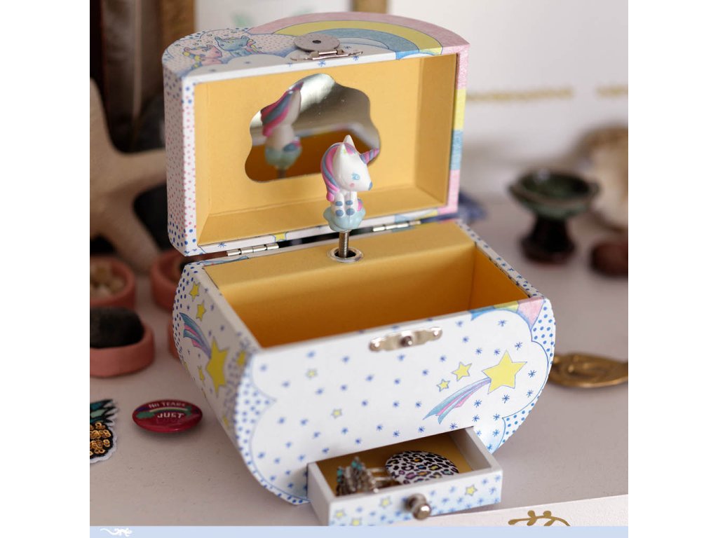 Hracia skrinka a šperkovnička Jednorožec Obláčik plný pokladov: šperkovnička s jednorožcom a zásuvkouHracia skrinka a šperkovnička Jednorožec ukrýva miesto na prstienky, náramky aj malé tajomstvá. Po otvorení sa rozoznie melódia a jednorožec sa začne otáčať pred zrkadielkom. Praktická zásuvka pomôže udržať poriadok.Rýchly prehľad odporúčaný vek: od 4 rokov funkcia: šperkovnička so zásuvkou + hudobný mechanizmus rozvíja: poriadkumilovnosť, estetické cítenie, rituályPrečo si ju deti zamilujú jednorožec sa otáča pri melódii zrkadielko a zamatový interiér zásuvka na drobnosti melódia hrá približne 2,5 minútyAko sa používa Natočte mechanizmus a otvorte veko. Uložte šperky do priehradky alebo do zásuvky. Po zatvorení bude všetko pripravené na ďalšie otvorenie.Obsah balenia 1× hracia šperkovnička so zásuvkouTechnické parametre rozmer: cca 14,7 × 14,2 × 8,2 cm melódia: hrá približne 2,5 minúty materiál: drevo potiahnuté papierom, zamatový interiérDodatočné parametre