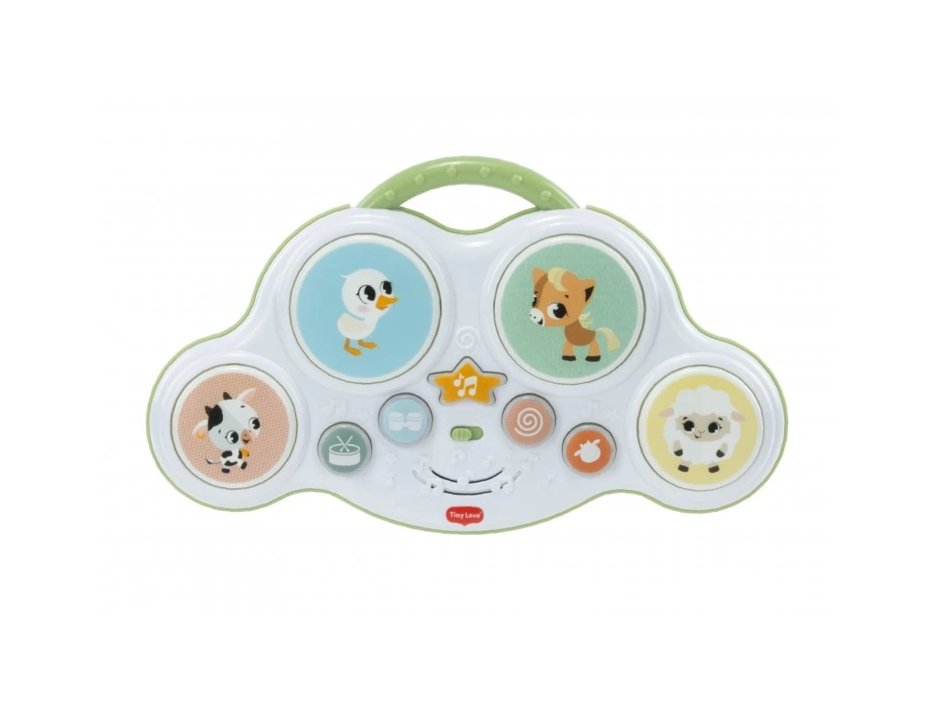 Hudobný pult s bubienkami Tiny Love Farmers Funday deťmi zábavnou formou motivuje k objavovaniu zvukov, rytmu aj zvieratiek. Štyri bubienkové plochy a svetelné tlačidlá spúšťajú bubnové rytmy, vtipné zvuky i farmárske zvieracie efekty, takže hra dieťa dlho udrží v pozornosti. Skvele sa hodí aj na hru na brušku – pomáha predlžovať dobu hrania na brušku, čo podporuje posilňovanie a prípravu na ďalšie motorické míľniky. Zároveň je to ideálna hračka pre spoločné chvíle rodičov s dieťaťom – môžete spolu napodobňovať zvuky, skúšať rytmy a pomenovávať zvieratká.