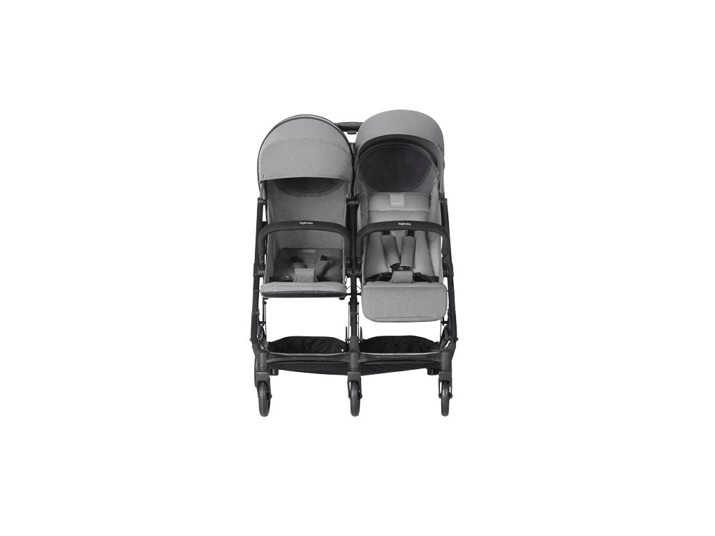 Ľahký a kompaktný kočík pre dvojčatá v sivej farbe, dobre ho využijete aj pre vekovo blízkych súrodencov. Vhodný už od narodenia.
