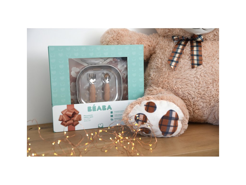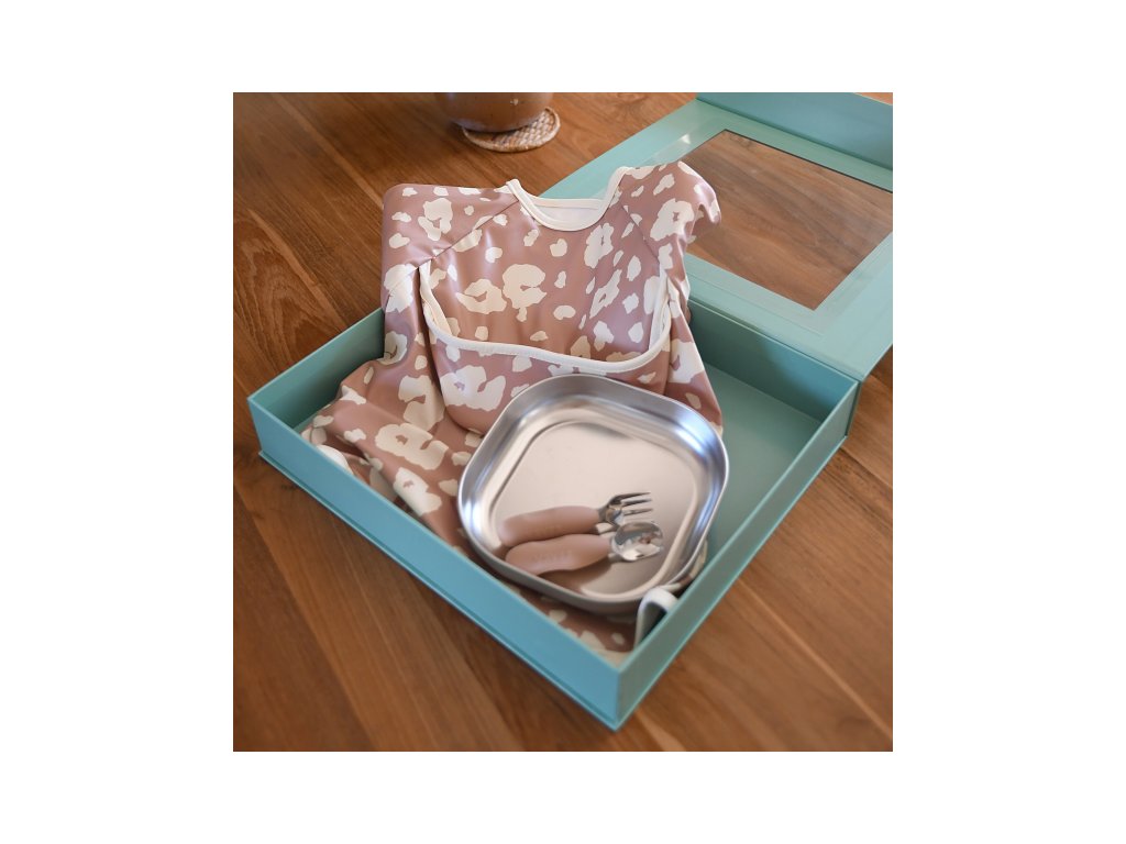 Jedálenskú sadu pre najmenších tvorí nerezový tanier so silikónovou povrchovou vrstvou, ergonomická tréningová lyžička a vidlička a podbradník s odopínacími rukávmi a vreckom na omrvinky. Krásnu krabičku, v ktorej je sada zabalená môžete používať aj ako krabičku na drobnosti.