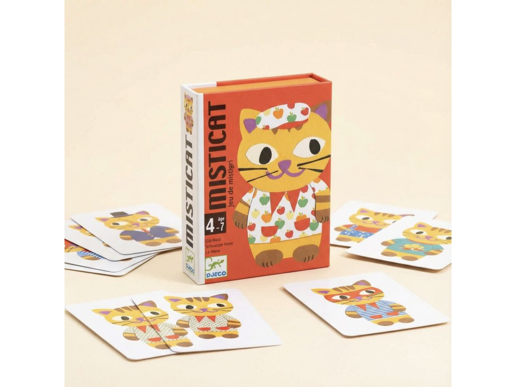Kartová hra Čierny PeterNájdite dvojice a vyhnite sa tajomnej mačke!Misticat je hravá a krásne ilustrovaná kartová hra pre deti od 4 do 7 rokov, ktorá prináša modernú a zábavnú verziu klasického Čierneho Petra. Úlohou hráčov je zbierať čo najviac dvojíc – no medzi kartami sa ukrýva čudná mačka Misticat, ktorá všetko poriadne zamotá! Kto ju bude mať na konci hry, prehráva. Táto jednoduchá, no napínavá hra je ideálna na prvé hráčske skúsenosti. Deti si pri hraní precvičujú pamäť, sústredenie aj pozorovacie schopnosti, učia sa trpezlivosti a zvládaniu napätia. Hra zároveň podporuje komunikáciu a spoločné plánovanie, takže je výborná pre rodiny aj menšie detské kolektívy. Kompaktné balenie umožňuje vziať si ju kamkoľvek – na dovolenku, do auta, k starým rodičom či na piknik. Jedna partia trvá len pár minút, no zabaviť dokáže na celé hodiny.Prečo si deti (a rodičia) Misticat zamilujú? jednoduché pravidlá vhodné už pre predškolákov napínavý priebeh – nikdy neviete, kde sa skrýva tajomná mačka podporuje pamäť, pozornosť a rýchle rozhodovanie krásne, hravé ilustrácie deti okamžite zaujmú krátke a svižné partie – ideálne na každodenné hranie Obsah balenia 33 kariet s farebnými dvojicami špeciálna karta Misticat pravidlá hry Počet hráčov: 2–4 Vek: 4–7 rokov Tu nájdete návodDodatočné parametre