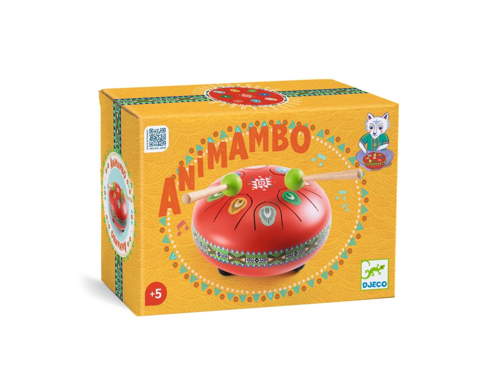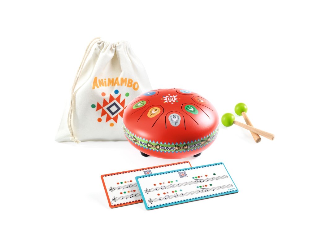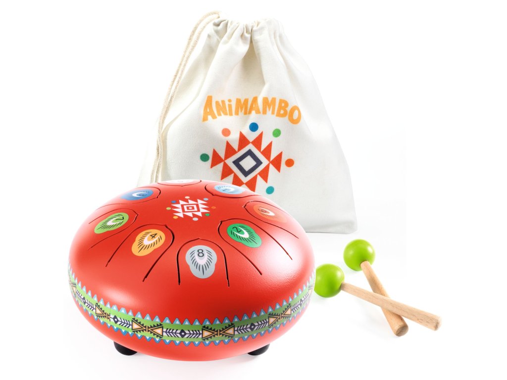 Kovový červený bubon Animambo Jazýčkový bubon s 8 tónmi: jemný zvuk, jednoduché hranie a možnosť stlmiť hlasitosťKovový červený bubon Animambo je intuitívny perkusný nástroj, ktorý umožní deťom ľahko vytvárať rytmy aj jednoduché melódie.Bubon má 8 kovových jazýčkov – každý zodpovedá jednému tónu a je označený tak, aby sa dieťa vedelo rýchlo zorientovať.Hrá sa jemným úderom paličkami na jednotlivé jazýčky; nástroj znie mäkko a harmonicky, preto je vhodný aj na pokojnejšie „hudobné“ chvíle.Pre tichšie hranie je na spodnej strane gumová zátka, ktorá pomáha zvuk utlmiť.Ako to funguje Začni jednoducho: dieťa skúša jednotlivé tóny a strieda údery ľavou/pravou rukou. Hraj podľa kariet: priložené karty s notami ukazujú 4 melódie – tónom zodpovedajú označenia na bubne. Tvor vlastné melódie: kombinovaním tónov dieťa prirodzene rozvíja cit pre rytmus a postupnosť.Obsah balenia 1× kovový jazýčkový bubon (priemer cca 16 cm) s 8 tónmi 2× drevená palička s gumovou koncovkou 2× obojstranná kartička s notami (spolu 4 melódie)Rýchly prehľad odporúčaný vek: od 5 rokov počet tónov: 8 priemer: cca 16 cm praktický detail: gumová zátka na stlmenie zvuku rozvíja: rytmus, sluchové vnímanie, koordináciu oko–ruka, jemnú motorikuDodatočné parametre