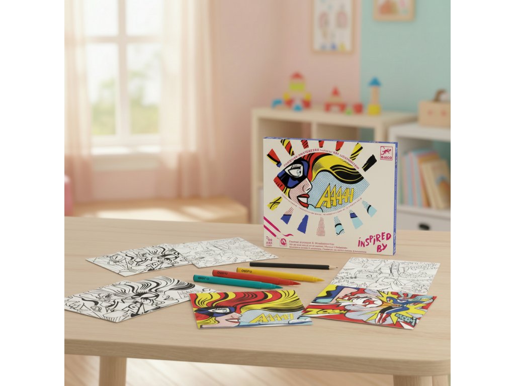 Kreatívna sada Maľovanie podľa Roya Lichtensteina Pop-art ako z komiksu: vyfarbi 4 superhrdinské scény a dotvor ich prenosovými bodkami a detailmiKreatívna sada Maľovanie podľa Roya Lichtensteina je výtvarná aktivita v štýle Pop Art, ktorá kombinuje maľovanie a prenosové obrázky.Deti najprv postupne vyfarbia pripravené komiksové scény pomocou fixiek so štetcovým hrotom a potom ich dotvoria typickými bodkami, šrafovaním a efektmi pomocou prenosových hárkov.Vďaka jasnému postupu a obmedzenej palete farieb (modrá, červená, žltá, svetlomodrá) vzniká výsledok, ktorý pôsobí umelecky a „galerijne“ aj bez predchádzajúcich skúseností.Farebný návod vedie krok za krokom a pomáha vytvoriť charakteristický pop-artový vzhľad.Rýchly prehľad odporúčaný vek: od 7 rokov rozvíja: jemnú motoriku, cit pre farby, trpezlivosť, sústredenie, kompozičné vnímanie v balení: 4 ilustrované karty, 4 fixky, 4 hárky prenosov, farebný návodPrečo si ju deti zamilujú kombinácia 2 techník – maľovanie + prenosové detaily ikonický komiksový efekt vďaka bodkám a šrafovaniu fixky so štetcovým hrotom umožnia tenké aj širšie ťahy 4 hotové obrázky – ideálne na vystavenie alebo darovanieAko to funguje Vyber si kartu a vyfarbi plochy podľa návodu (najprv svetlé, potom tmavšie akcenty). Po vyfarbení prilož prenosový hárok na vybrané miesto. Pomocou ceruzky alebo tupého predmetu pretri vzor, aby sa preniesol na obrázok. Pokračuj detailmi (bodky, výrazy, textúry, efekty), kým nebude scéna „komiksovo“ živá.Obsah balenia 4× ilustrovaná karta (20 × 20 cm) 4× fixka so štetcovým hrotom (modrá, červená, žltá, svetlomodrá) 4× hárok prenosových obrázkov 1× farebný návod krok za krokomTechnické parametre technika: maľovanie fixkami + prenosové obrázky počet obrázkov: 4 rozmer kariet: 20 × 20 cm materiál: papier/kartón, fixky, prenosové hárkyDodatočné parametre