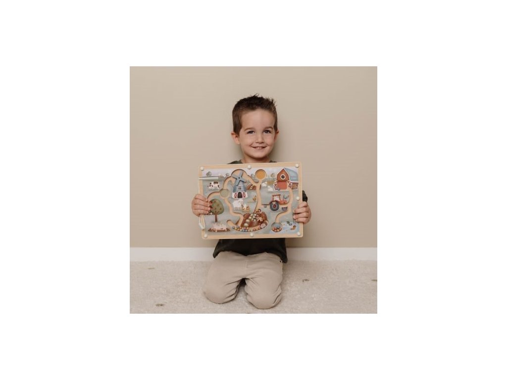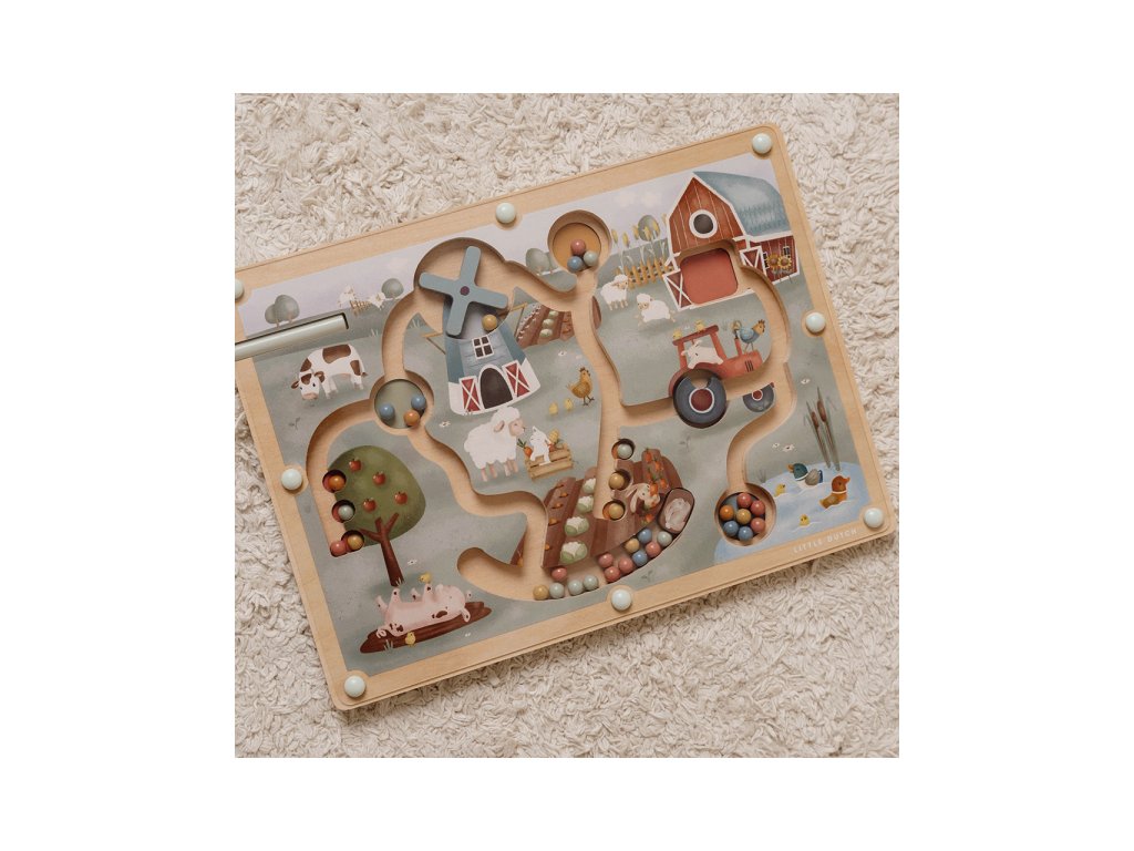 Originálna hračka s magnetickým perom, ktorým sa posúvajú farebné guličky dráhami dreveného bludiska s krásnymi ilustráciami zo života na farme. Môžete sa napríklad s vašim dieťaťom rozhodnúť, že všetky modré guličky presunie do jazierka a dve červené guličky presunie na jabloň. Cestou bude potrebné prekonať aj prekážky, ako je otočné koleso traktora alebo lopatky veterného mlyna. Ilustrácia nabáda aj k vymýšľaniu príbehov zo života na farme.