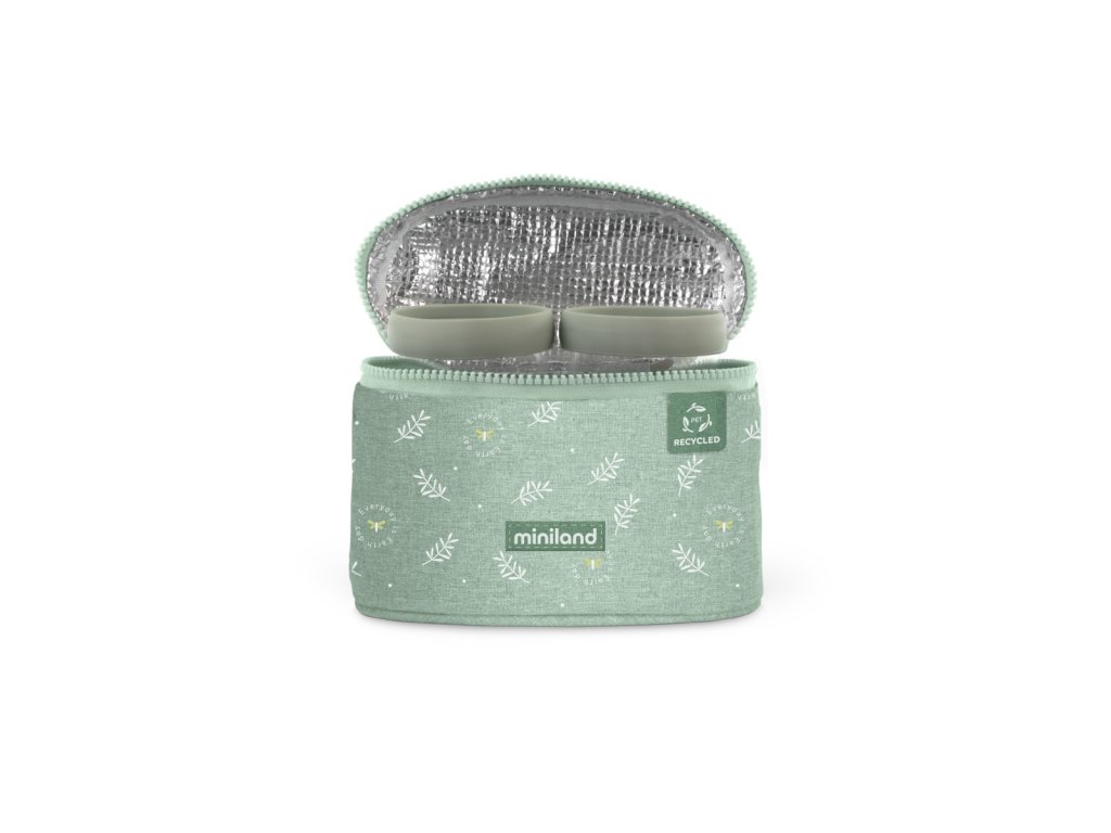 Pre pohodlnú a bezpečnú prepravu je súčasťou setu izotermická taška. Taška má izolačné vnútro, ktoré pomáha dlhšie udržať potraviny čerstvé a v stabilnej teplote. Taška je vyrobená z recyklovaného materiálu (rPET), čím je tento set plne v súlade s ECO-friendly filozofiou Miniland.