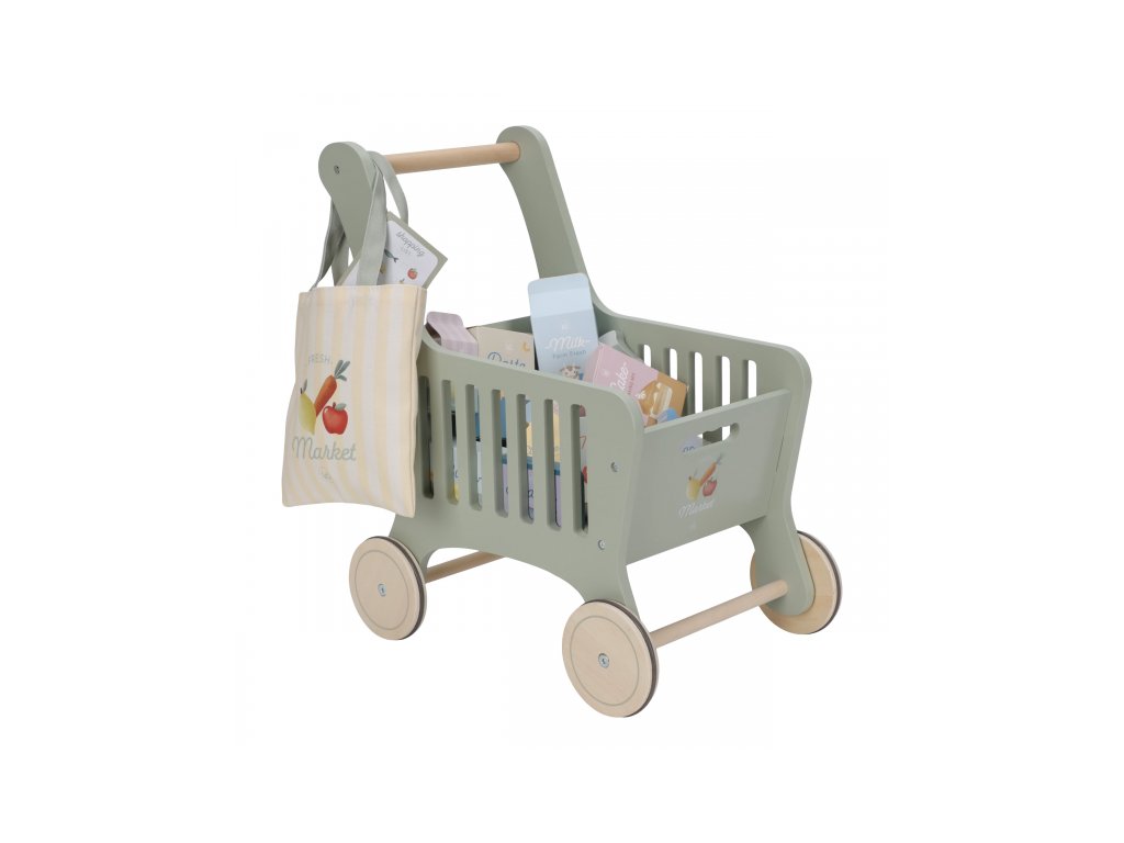 Vozík je vyrobený z odolného dreva v jemnom zelenom odtieni a je vybavený štyrmi hladko sa otáčajúcimi kolieskami a širokou rukoväťou, ktorá zaisťuje stabilné a pohodlné držanie aj pre tých najmenších. Vďaka priestornému úložnému priestoru sa do neho zmestí množstvo nákupov.