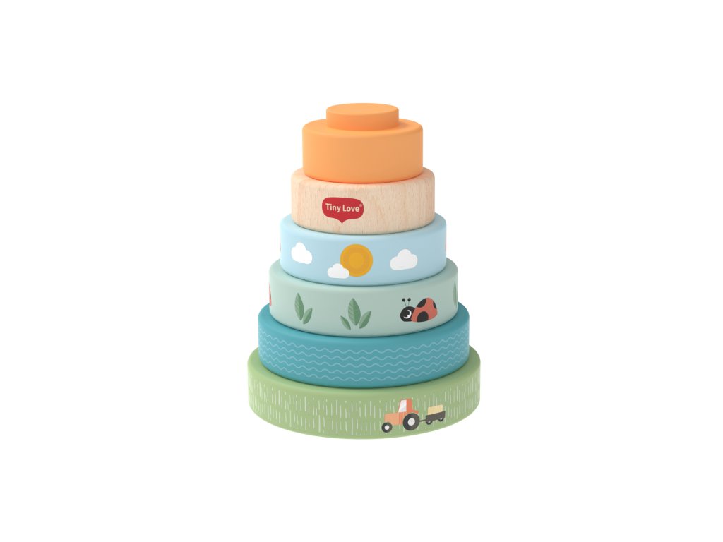 Drevené nasadzovacie krúžky Tiny Love ponúkajú rôzne možnosti hrania - deti ich môžu nasadzovať a stavať do veže, triediť podľa veľkosti, kotúľať s nimi a postupne objavovať a rozlišovať farby, veľkosti a jednoduché súvislosti. Krúžky s krásnou potlačou motívov zo života na farme sú ľahké a dobre sa držia aj malými detskými ručičkami.Hračka prirodzene rozvíja jemnú motoriku, koordináciu ruka-oko aj prvé logické myslenie.