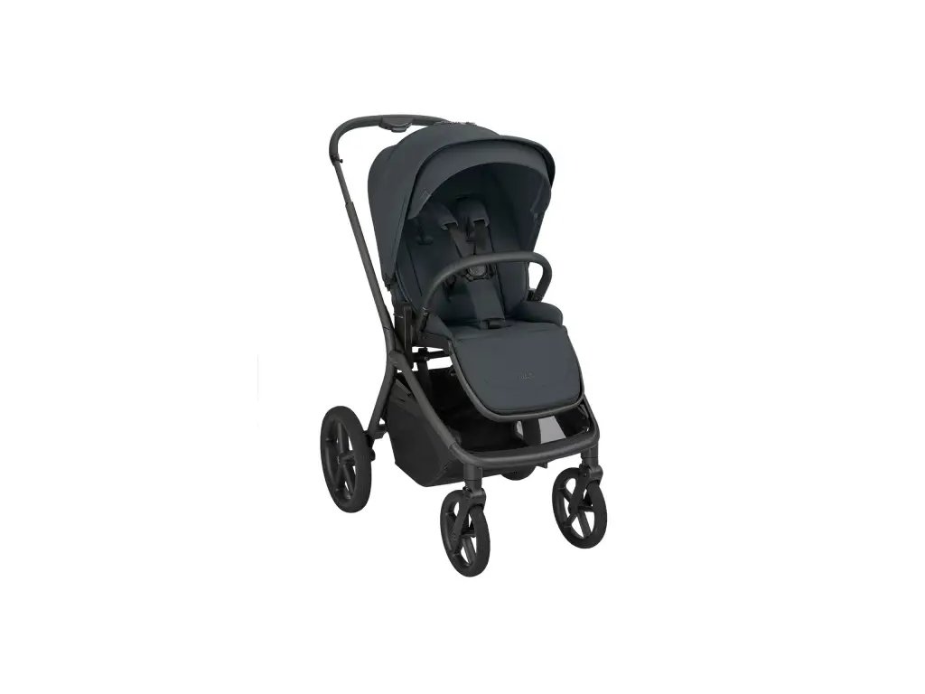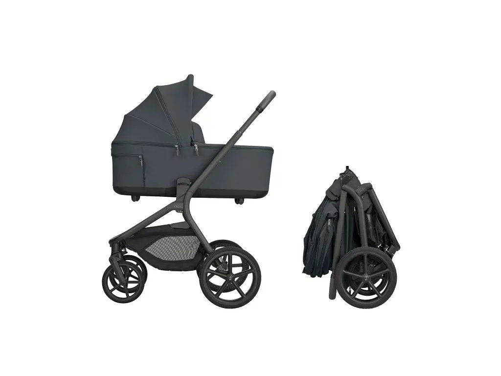 Po zložení kočík samostatne stojí. Pre ľahké prenášanie je pripravený popruh cez rameno a madlo.