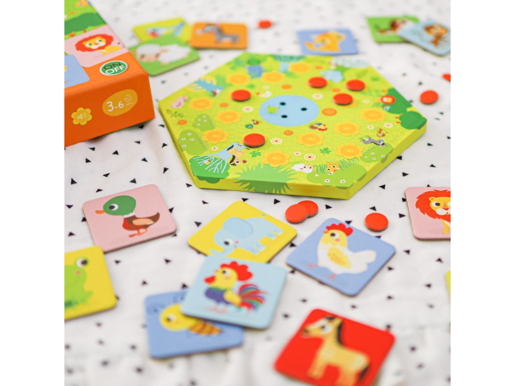 Pexeso ZvukovéHra na tréning pamäte pre najmenšíchZvuková spoločenská hra, ktorá spája klasický princíp pexesa s interaktívnymi zvukmi! Počas hry budete počúvať zvuky zvierat, ktoré sa spustia po stlačení jedného zo žltých tlačidiel na hracej doske. Vašou úlohou je nájsť kartičku so zvieratkom, ktorému tento zvuk patrí. Aby sa vám to podarilo, musíte si zapamätať, aký zvuk je priradený k jednotlivým tlačidlám a kde sú kartičky rozložené. Výborná hra na tréning pamäte, ktorá deti nielen zabaví, ale aj pomôže rozvíjať ich kognitívne schopnosti. Keď nájdete pár kartičiek so zvukom, ktorý zodpovedá zvieratku, môžete si ho vziať a na príslušné žlté tlačidlo umiestniť červený žetón. Hráč, ktorý nazbiera najviac kartičiek, vyhráva. Pred každou novou hrou zamiešajte kartičky a stlačením zeleného tlačidla obnovíte zvuky pre novú výzvu.Vlastnosti a výhody hry: Skvelý spôsob, ako trénovať pamäť detí a zlepšiť ich schopnosť sústrediť sa. Zábavná a interaktívna: Každé stlačenie tlačidla prináša nový zvuk, ktorý deti motivuje k hre. Podporuje rozpoznávanie zvieratiek a učí deti spojovať zvuky s obrázkami. Rýchla a jednoduchá hra pre malé deti (odporúčaný vek: 3–6 rokov). Doba trvania hry cca 10 minút, ideálna pre krátke, ale zábavné herné seansy. Obsah balenia: 1 elektronická herná doska s reproduktorom (prehráva zvuky) 16 kartičiek so zvieratkami 16 červených žetónov Návod Počet hráčov: 2–4Tu nájdete pravidlá hryDodatočné parametre
