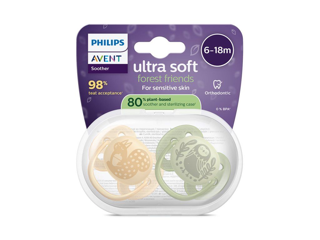 Mimoriadne jemné pre citlivú pokožku Navrhnuté na zníženie podráždenia pokožky** Prémiová starostlivosť o citlivú pokožku s ohybným náustným štítom. 9 z 10 rodičov súhlasí: moje dieťa nemá podráždenie pokožky po tom, ako začalo používať cumlík ultra soft.** Upokojujúca úľava je vždy nablízku, bez ohľadu na to, kto sa o dieťa stará. Teraz obsahuje až 80 % materiálov rastlinného pôvodu.* Pre citlivú pokožku dieťaťa • Mäkký a ohybný náustný štít znižuje podráždenie** • Ortodontický cumlík navrhnutý pre prirodzený vývoj ústnej dutiny • Obľúbené bábätkami s 98 % prijatím cumlíkov*** • Navrhnuté v spolupráci s odborníkmi z oblasti starostlivosti o zdravie a rodičmi Praktické, bezpečné a teraz ešte ekologickejšie • Šetrnejšie k planéte, keďže obsahuje 80 % materiálov rastlinného pôvodu* • Puzdro na sterilizáciu a prenášanie na rýchlu a jednoduchú hygienu Mäkký a ohybný náustný štít Detská pokožka potrebuje mimoriadnu starostlivosť. Technológia mäkkého náustného štítu kopíruje prirodzené krivky tváre vášho dieťaťa, takže sa na pokožke vyskytuje menej škvŕn a menej podráždenia**. Náš zaoblený náustný štít minimalizuje tlak na tvár pre väčšiu jemnosť. Ortodontický silikónový cumlík Naše ortodontické cumlíky sú navrhnuté s použitím mäkkého silikónu, ktorý podporuje prirodzené pohyby svalov v ústach a pomáha znižovať riziko vzniku chybného chrupu. Úzky kŕčok cumlíka je navrhnutý tak, aby znižoval tlak medzi jazykom a podnebím. Cumlíky Philips Avent ultra sú nezávisle akreditované nadáciou Oral Health Foundation. Sú vyrobené zo 100 % potravinárskeho silikónu, sú odolnejšie a trvácnejšie ako gumené (latexové) cumlíky a neobsahujú BPA, BPS, ftaláty, PVC a polycyklické aromatické uhľovodíky. 98 % prijatie cumlíkov Naše textúrované silikónové cumlíky sú navrhnuté tak, aby napodobňovali pocit maminho prsníka. Keď sme sa rodičov pýtali, ako na ne reagujú ich malé deti, v priemere 98 % z nich uviedlo, že ich deti prijali cumlíky Philips Avent ultra. Navrhnuté v spolupráci s odborníkmi Pri vývoji jedinečného dizajnu cumlíkov Philips Avent ultra soft sme úzko spolupracovali s rodičmi a odborníkmi z oblasti starostlivosti o zdravie. 80 % materiálov rastlinného pôvodu* Udržateľnejšie voľby vám umožnia poskytnúť tú najlepšiu starostlivosť s menším dopadom na planétu. Kompletný sortiment Philips Avent ultra obsahuje cumlíky a puzdrá na sterilizáciu vyrobené z 80 % z rastlinných materiálov.* Puzdro na sterilizáciu a prenášanie Puzdro na prenášanie slúži ako sterilizátor, takže cumlíky sú vždy pripravené, keď ich potrebujete. Stačí pridať vodu a 3 minúty ohrievať v mikrovlnnej rúre na jednoduchú sterilizáciu, pri ktorej vzniká až o 50 % menej emisií CO2.*** * Tvrdé plastové časti okrem silikónového cumlíka (prístup založený na hmotnostnej rovnováhe). * *Spotrebiteľský test v USA z roku 2023 potvrdil 98 % akceptáciu textúrovaného cumlíka Philips Avent použitého v cumlíkoch ultra (n = 201). * **V porovnaní s tradičnými metódami sterilizácie (varenie) cumlíkov. * ***Z hygienických dôvodov vymieňajte cumlíky za nové po 4 týždňoch používania. Výstraha: Puzdro, voda a cumlíky môžu byť aj po 5 minútach chladenia stále horúce. Pri nesprávnej výške hladiny vody, nesprávnom výkone mikrovlnnej rúry či nesprávnej dĺžke jej použitia nemusí sterilizácia prebehnúť správnym spôsobom a môže dôjsť k poškodeniu puzdra alebo cumlíkov. Toto puzdro používajte iba s priloženými cumlíkmi. Puzdro odkladajte mimo dosahu detí. Pre bezpečnosť vášho dieťaťa! UPOZORNENIE! Pred každým použitím dôkladne skontrolujte. Potiahnite cumlík všetkými smermi. Pri prvom náznaku poškodenia či opotrebovania ho odhoďte. Používajte iba výhradne určené držiaky cumlíkov testované podľa normy EN 12586. K cumlíku nikdy nepriväzujte iné stužky ani šnúrky, mohlo by dôjsť k uškrteniu dieťaťa! Vždy sa uistite, že vaše dieťa používa cumlík správnej veľkosti. Tento výrobok sa musí vždy používať pod dozorom dospelej osoby. Pred prvým použitím: Cumlík vložte na 5 minút do vriacej vody. Nechajte ho vychladnúť a potom z neho vytlačte všetku vodu. Zabezpečíte tak dostatočnú hygienu. Pred každým použitím: Čistite teplou vodou a jemným mydlom. NEPOUŽÍVAJTE abrazívne čistiace prostriedky. Cumlíky sú vhodné pre všetky bežne používané spôsoby sterilizácie. Skôr než sa dotknete sterilizovaných cumlíkov, dôkladne očistite povrchy aj svoje ruky. Ak chcete pripevniť držiak na cumlík, použite iba otvor v ušku cumlíka (odporúča sa použiť držiak na cumlík s tenkou šnúrkou). Z bezpečnostných a hygienických dôvodov po 4 týždňoch používania cumlík vymeňte. Ak cumlík uviazne v ústach, NEPANIKÁRTE. Nedá sa prehltnúť a je navrhnutý tak, aby ste si s takouto udalosťou poradili. Čo najopatrnejšie ho vyberte z úst dieťaťa. Vrchnú časť cumlíka nikdy nenamáčajte do sladkých látok ani do liekov, pretože by sa mohol poškodiť chrup dieťaťa. Cumlík nenechávajte na priamom slnečnom svetle ani v blízkosti zdroja tepla, prípadne v sterilizačnom roztoku dlhšie, než sa odporúča, pretože by mohlo dôjsť k narušeniu jeho povrchu. Adresa výrobcu: Philips Consumer Lifestyle B.V., Tussendiepen 4, 9206 AD Drachten, The Netherlands, PH.CentralRegulatoryOfficer@philips.comDodatočné parametre