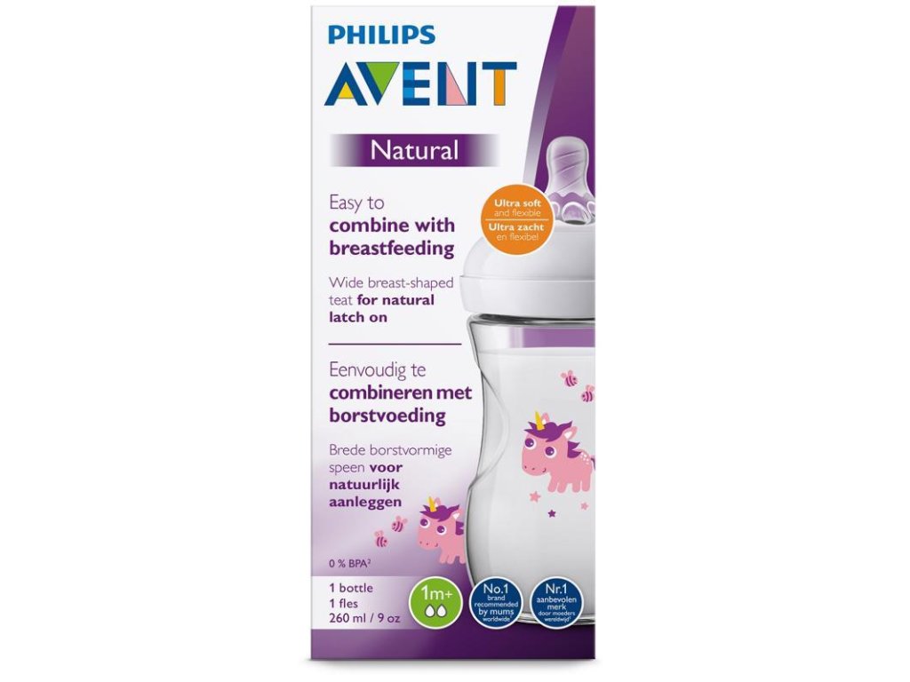 - neobsahuje Bisphenol (0%BPA) - fľaša Natural s extra mäkkým silikónovým cumlíkom s pomalým prietokom - univerzálna fľaša s mnohostranným použitím - MATERIÁL: polypropylén (PP) Vďaka našej fľaši radu Natural bude kŕmenie z fľaše prirodzenejšie – pre vaše dieťa i pre vás. Cumlík má inovatívny lupienkový dizajn, ktorý umožňuje prirodzené prisatie podobné bradavke, takže kombinovanie dojčenia a kŕmenia z fľaše bude pre vaše dieťa oveľa ľahšie. Pružný špirálový dizajn cumlíka tvorí v kombinácii s našimi jedinečnými pohodlnými lupienkami pružný cumlík, ktorý umožňuje prirodzenejšie kŕmenie a nevťahuje sa do vnútra. Pozrite si krátke video o produkte:- Ľahké uchopenie a držanie v ľubovoľnom smere Ergonomický tvar pre maximálne pohodlie - Ľahko sa používa a čistí Široké hrdlo fľaše uľahčuje plnenie a čistenie. Má len pár dielov, takže sa dá rýchlo a ľahko zložiť. - Prirodzené prisatie Široký cumlík v tvare bradavky podporuje prirodzené prisatie podobne ako pri bradavke na prsníku, preto dieťaťu výrazne uľahčí kombinovanie dojčenia a kŕmenia z fľašky. - Jedinečné pohodlné lupienky Cumlík má jedinečný lupienkový dizajn, ktorý zvyšuju mäkkosť a ohybnosť bez zvinutia sa cumlíka. Vaše dieťa si vychutná pohodlnejšie a spokojnejšie kŕmenie. - Zdokonalený systém potláčajúci koliku Inovatívny dizajn dvojitého ventilu potláča koliku a nepohodlie – privádza vzduch do fľaše a nie bruška dieťaťa. - Kompatibilita v celom sortimente výrobkov Nová fľaša na prirodzené kŕmenie Philips AVENT Natural je kompatibilná s väčšinou výrobkov radu Philips AVENT, okrem našich fliaš radu Klasik. Odporúčame používať fľaše Philips AVENT Natural len s cumlíkmi na kŕmenie Philips AVENT Natural. Používaním dojčenských fliaš AVENT s jedinečným patentovaným silikónovým cumlíkom s ventilom predchádzate prehĺtnutiu vzduchu počas kŕmenia a znižujete pravdepodobnosť vzniku koliky. Tvar fľaštičky zaisťuje vysokú stabilitu a pohodlné držanie. Široké hrdlo uľahčuje plnenie fľaštičky a jej čistenie. Priehľadná presná stupnica pomôže určiť, koľko Vaše dieťa vypilo. Viečko tesne prilieha k cumlíku, takže pri premiešavaní stravy alebo cestovaní nedochádza k vylievaniu obsahu fľaštičky. Široký tvar mäkkého cumlíka núti Vaše dieťa zoširoka otvoriť ústa a doslova sa k cumlíku prisať. Môže tak začať sať a používať pritom rovnaké pohyby jazyka a ďasien ako pri dojčení. To je dôvod, prečo je s AVENTOM ľahké kombinovať dojčenie s kŕmením z fľaštičky. Klinické pokusy prevedené univerzitami v Londýne a Cambridge preukázali, že novorodenci kŕmení fľaštičkami AVENT trpeli menej kolikami a po prebúdení boli spokojnejší než deti, ktoré boli kŕmené z obyčajných fliaš. Silikónový cumlík AVENT má jedinečný patentovaný okraj, ktorý funguje ako jednosmerný ventil. Cumlík umožňuje prúdenie vzduchu do fľaštičky počas kŕmenia, čím zamedzuje vzniku vákua vo fľaštičke. Dieťa sa nemusí cumlíka pri kŕmení púšťať a môže piť súvisle ako pri dojčení bez prehĺtnutia vzduchu. Šumivý zvuk je známkou toho, že vzduch prúdi do fľaštičky a nie do žalúdka Vášho dieťaťa. Práve prehĺtnutý vzduch počas kŕmenia vyvoláva plač spôsobený bolestivou kolikou alebo nafukovaním. Dojčenské fľaše AVENT Natural musia byť používané s priehľadným cumlíkom AVENT Natural, ktorý má na základni tesniaciu manžetu. UPOZORNENIE! - Nepretržité a dlhodobé sanie tekutín spôsobuje zubný kaz. - Vždy skontrolujte teplotu potravy pred podaním. - Pri prvom náznaku poškodenia či opotrebovania produkt odhoďte. - Počas nepouživania udržujte komponenty mimo dosah detí. - Nikdy nespájajte so šnúrami, stužkami, šnúrkami, alebo s voľnými časťami odevu, mohlo by dôjsť k uškrteniu dieťaťa. - Nikdy nepoužívajte cumlík na kŕmenie ako bežný cumlík. - Používajte tento výrobok výlučne pod dohľadom dospelých. Neodporúča sa používať mikrovlnnú rúru na zohrievanie detského jedla a nápojov. Mikrovlnné žiarenie môže zničiť cenné výživné látky v jedle alebo nápojoch. Okrem toho môže spôsobovať nerovnomerné ohriatie. Ak sa rozhodnete použiť mikrovlnnú rúru, buďte mimoriadne opatrní a zohriate jedlo alebo nápoje vždy zamiešajte, aby ste zabezpečili rovnomernú teplotu, a pred podávaním teplotu ešte skontrolujte. Do mikrovlnnej rúry vložte len nádobu bez krúžku so závitom, ventilu AirFree, cumlíka a viečka. Nedovoľte deťom, aby sa hrali s malými dielmi ani aby pri používaní fliaš chodili alebo behali. Na konci kŕmenia vždy vylejte všetko zvyšné materské mlieko. Pred každým použitím skontrolujte a potiahnite cumlík na kŕmenie všetkými smermi. Pri prvom náznaku poškodenia či opotrebovania produkt odhoďte. Adresa dodávateľa: Philips Consumer Lifestyle B.V., Tussendiepen 4, 9206 AD Drachten, The Netherlands, PH.CentralRegulatoryOfficer@philips.com