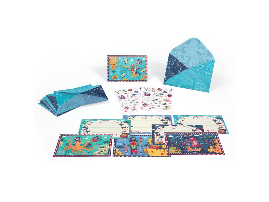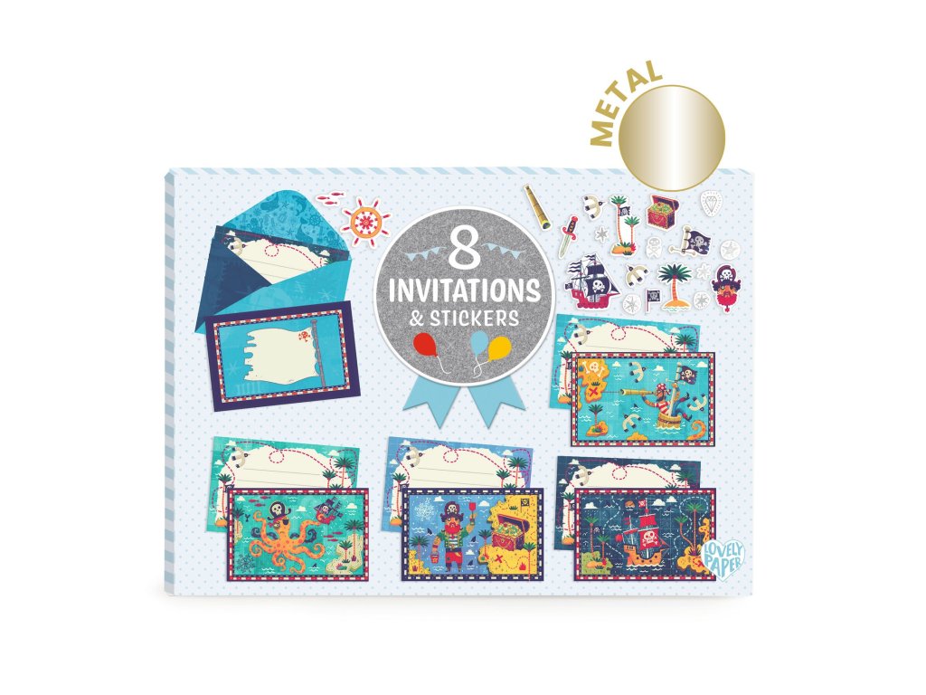 Pozvánky & samolepky PirátiVeselá pirátska sada na oslavy a tvoreniePiráti – 8 pozvánok a samolepiek je zábavná sada pre deti, ktorá obsahuje 8 farebných pozvánok s pirátskou témou, 8 ilustrovaných obálok a samolepky na ich ozdobenie. Sada je ideálna na narodeninové oslavy, tematické párty alebo na tvorivé aktivity.Každý dizajn má metalické detaily a matnú potlač.Prečo si vybrať sadu od Djeco8 pozvánok s pirátskym motívomsamolepky na ozdobenieskvelé na oslavy a tvorivé hryObsah balenia8 kusov pozvánok s pirátskymi ilustráciami8 obálok2 hárky samolepiek na zdobenieDodatočné parametre