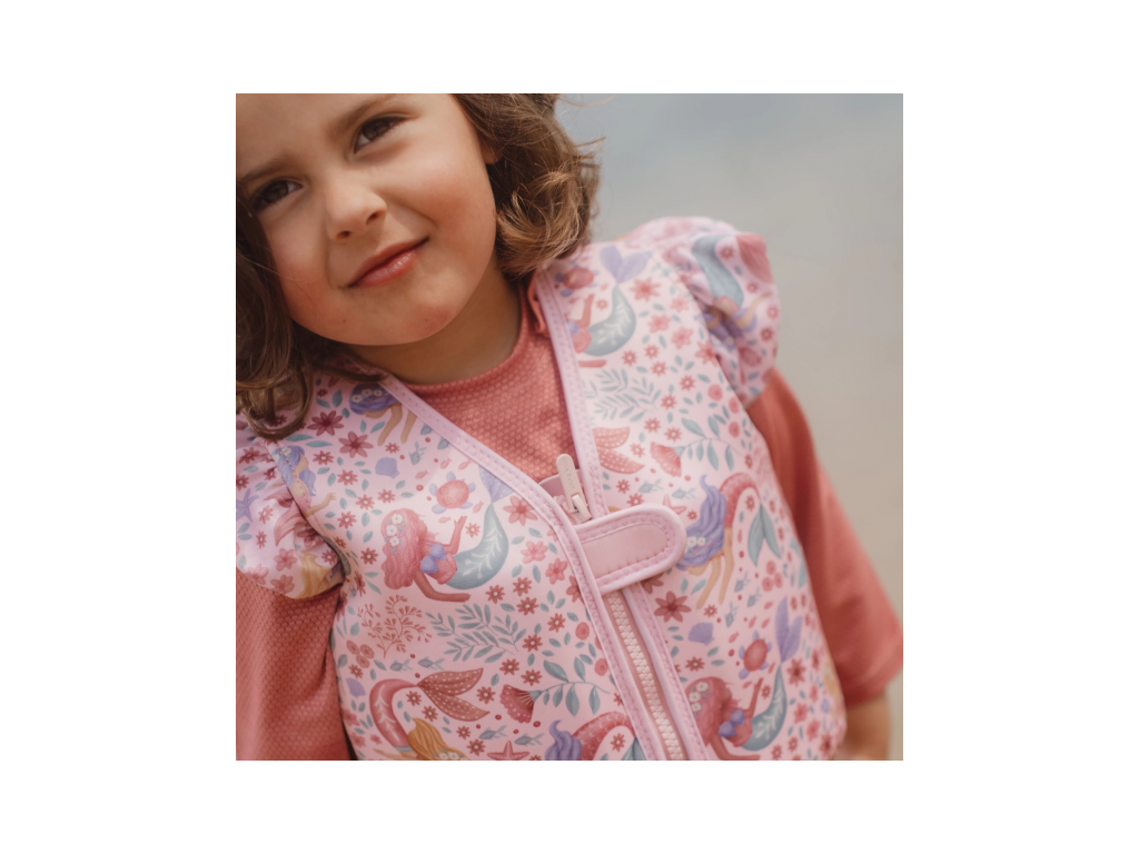 Plávacia vesta s krásnou potlačou morskej víly a kvetov pomôže vášmu dieťaťu získať istotu pri plaveckých začiatkoch a zároveň mu zaistí optimálnu voľnosť pohybu. Vďaka zapínaniu na zips sa vesta z príjemného neoprénového materiálu ľahko oblieka a vyzlieka.