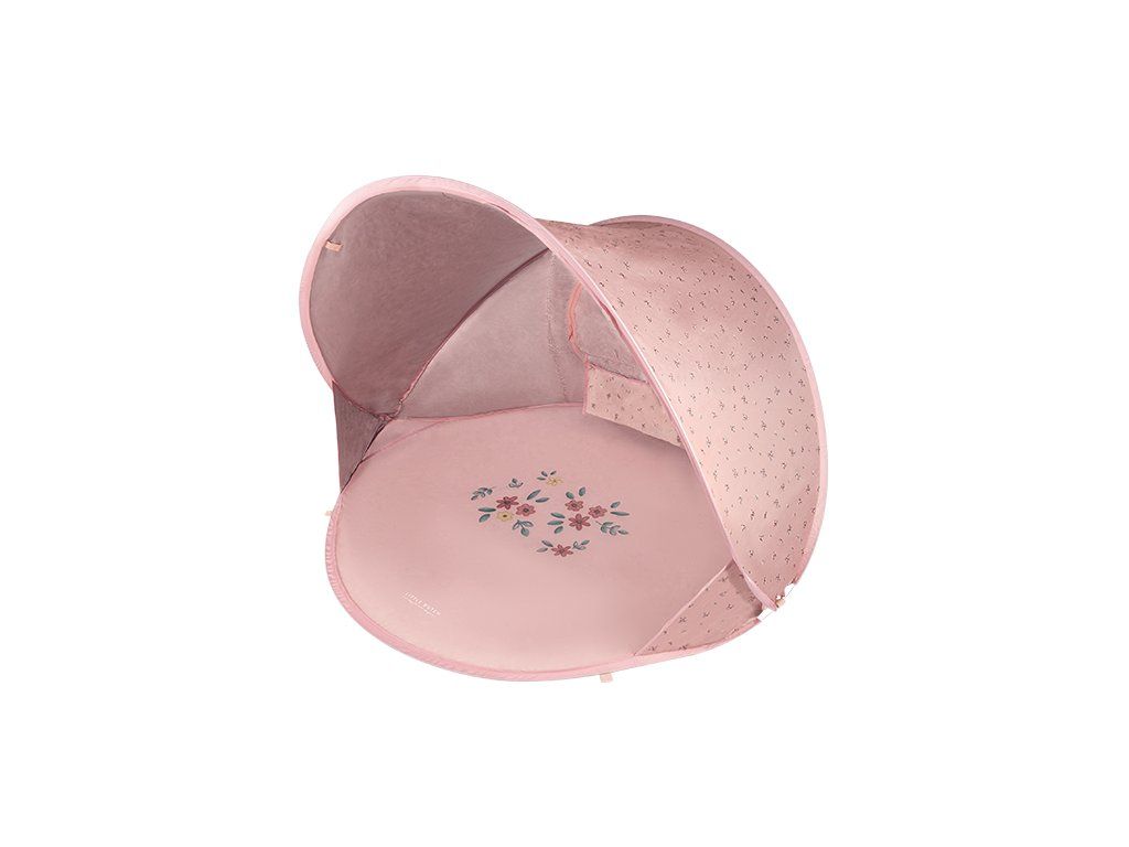 Prenosný skladací stan s UV faktorom 40+ na ochranu dieťaťa pred slnkom na záhrade, na pláži či na výletoch do prírody. Stan umožňuje jednoduchú ventiláciu vďaka zadnému okienku na zips. Dve vrecká na vnútornej stene ponúkajú priestor na uloženie drobností.