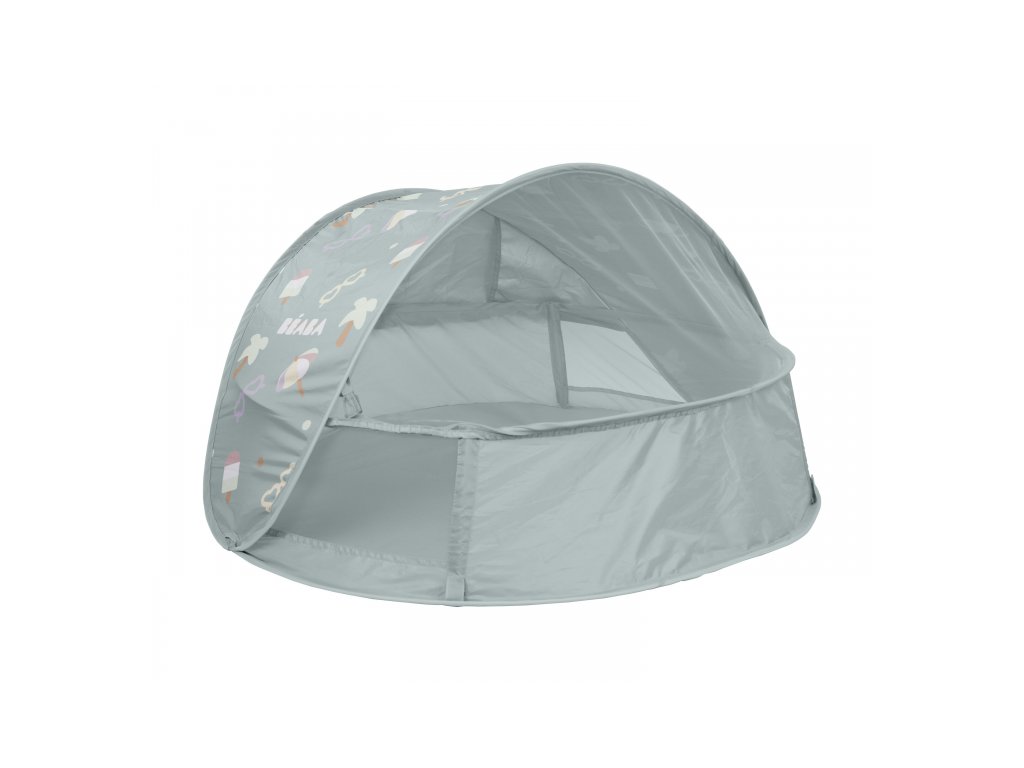 Prenosný univerzálny stan s UV faktorom 50+ na ochranu dieťaťa pred slnkom na záhrade, na pláži či na výletoch do prírody. Stan umožňuje ľahkú ventiláciu vďaka bočným otvorom so sieťovinou a textilnými chlopňami, ktoré je možné zrolovať. Sieťovina chráni dieťa v stane pred ťažkým hmyzom. Tkanina s chladivým efektom pomáha znižovať teplotu vo vnútri stanu.