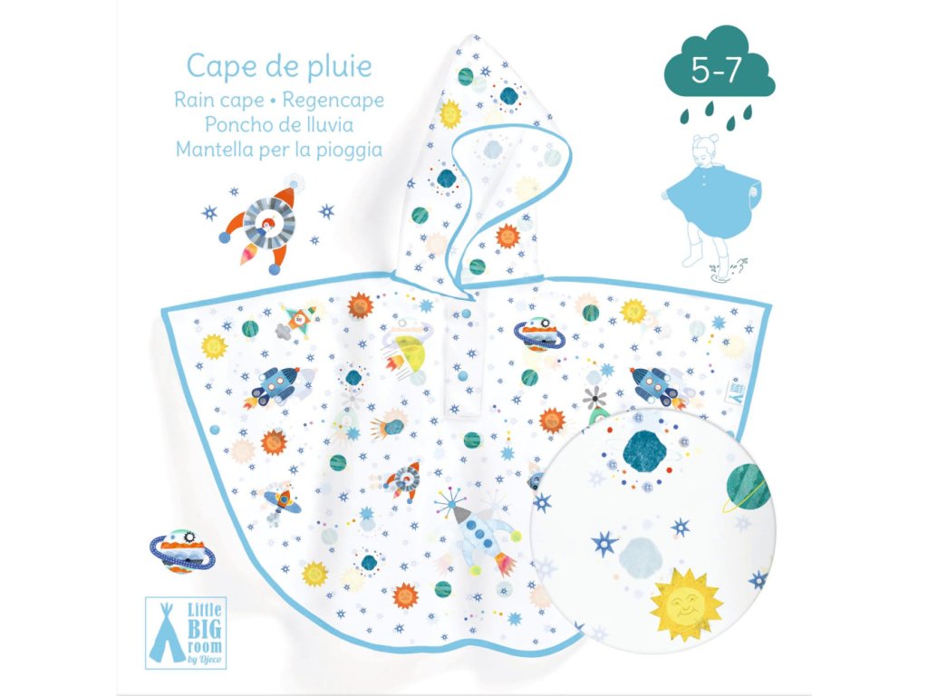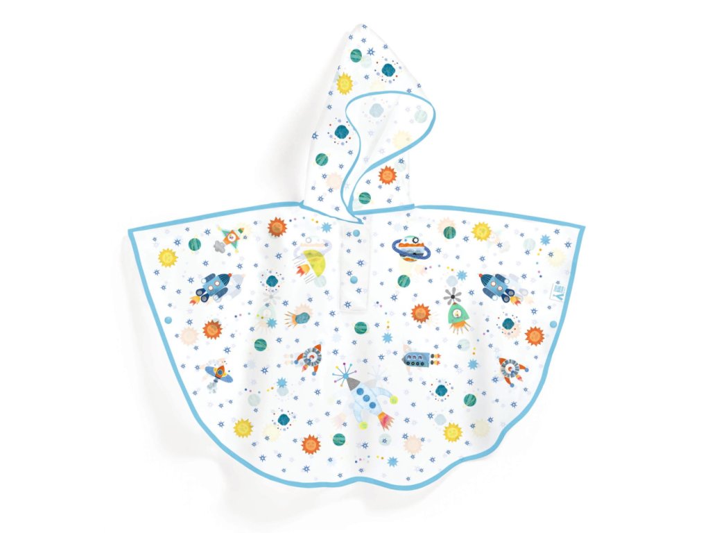 Vystrájanie v daždi nie je pre deti žiadna prekážka s praktickým pršiplášťom s motívom rakety. Praktický a štýlový pršiplášť z mäkkého, polopriesvitného plastu, ktorý sa príjemne nosí. Potlač s vesmírnymi motívmi je svieža a pekná.Chráni pred dažďom a vetrom. Pončo je po celom obvode obšité textilným lemom. Kapucňa je napevno, neodopína sa. Na rukávoch a na výstrihu má zapínanie na cvoky, vďaka čomu sa ľahko prevlieka cez hlavu a okolo ramien si drží tvar. Obsah: 1 pončo do dažďa. Odporúčaný vek: 5 - 7 rokov. Rozmery: 90 x 46 cm.Dodatočné parametre