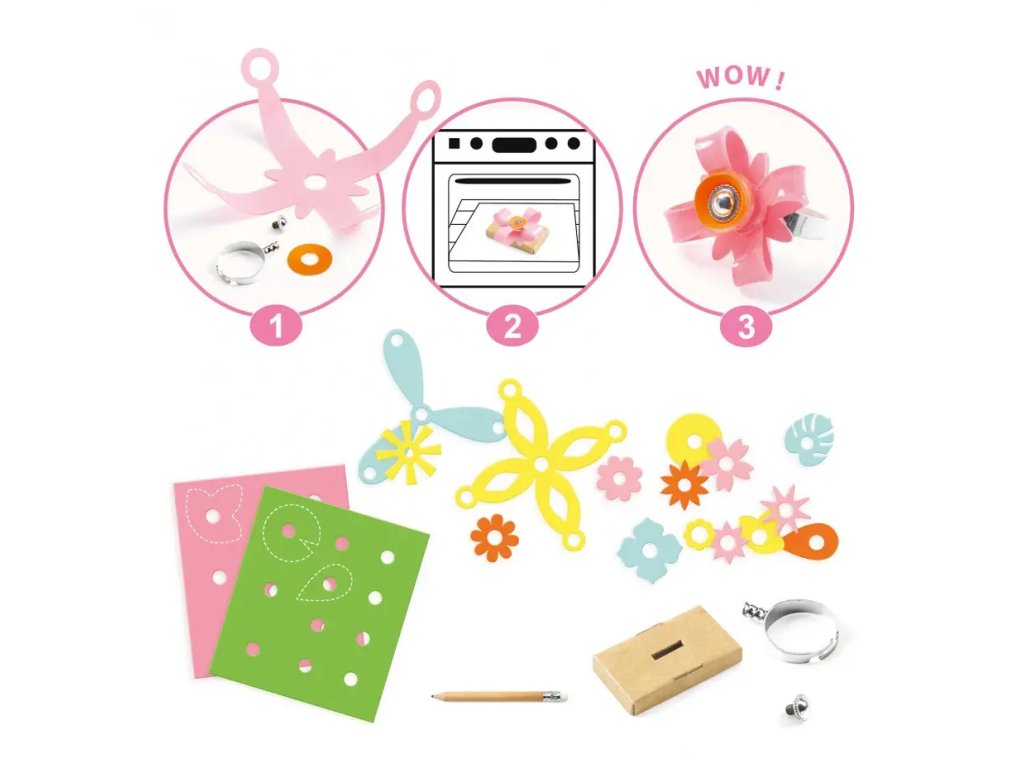 Prstene Kvetiny Vytvorte si prsteň v tvare kvetiny Prstene Kvetiny sú krásne a farebné prstene určené pre malé dievčatá, ktoré sa rady obklopujú farebnými a veselými doplnkami. Sada na tvorbu prsteňov deti nie len poteší, ale pomáha rozvíjať ich motorické schopnosti a kreativitu.Sada na tvorbu prsteňov pre malé princezné Z magického plastu si môžete vytvoriť farebné kvietkové prstene. Na zhotovenie prsteňov je potrebné použiť predvyrezané komponenty. Okrem toho máte k dispozícii 2 hárky magického plastu na vytvorenie vlastných komponentov. Pripravené komponenty je vložíte do rúry, kde sa scvrknú a stuhnú. Vytvoríte si tak 5 prstene, z toho 2 také, na ktorých môžete vymieňať a kombinovať komponenty a následne ich striedať podľa nálady.Dodatočné parametre