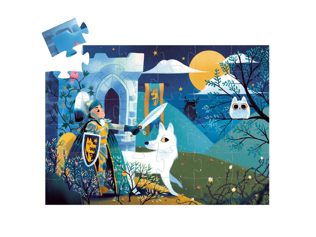 Puzzle Mesačný rytier 36 ks V splne mesiaca stráž hrad: poskladaj rytiera a bieleho vlka z 36 veľkých dielikovPuzzle Mesačný rytier je nádherne ilustrované puzzle pre predškolákov, ktoré rozpráva príbeh odvahy pod mesačným svitom.Deti skladajú 36 veľkých dielikov do obrázka s rozmerom 42 × 30 cm a popritom si všímajú detaily – hrad, nočnú oblohu aj verného vlčieho spoločníka.Puzzle je uložené v siluetovej krabičke v tvare rytiera, ktorá vyzerá skvelo na poličke a zároveň uľahčí upratovanie.Rýchly prehľad odporúčaný vek: od 4 rokov počet dielikov: 36 rozvíja: jemnú motoriku, koordináciu oko–ruka, sústredenie, trpezlivosť v balení: 36 dielikov + siluetová krabičkaPrečo si ho deti zamilujú veľké dieliky sa dobre držia a skladajú nočná ilustrácia podporí fantáziu a rozprávanie príbehov siluetová krabička je krásna dekorácia do detskej izby vyrobené z FSC papiera a kartónu – vhodné na opakované skladanieAko sa s tým hrá Vysyp dieliky a otoč ich obrázkom nahor. Začni okrajmi a potom dopĺňaj stred podľa farieb a tvarov. Po zložení si spolu vymyslite, koho rytier chráni a kam sa vydá s vlkom ďalej.Obsah balenia 36× dielik puzzle 1× siluetová krabička v tvare rytieraTechnické parametre rozmer zloženého puzzle: 42 × 30 cm materiál: papier a kartón (FSC) počet hráčov: 1+Dodatočné parametre