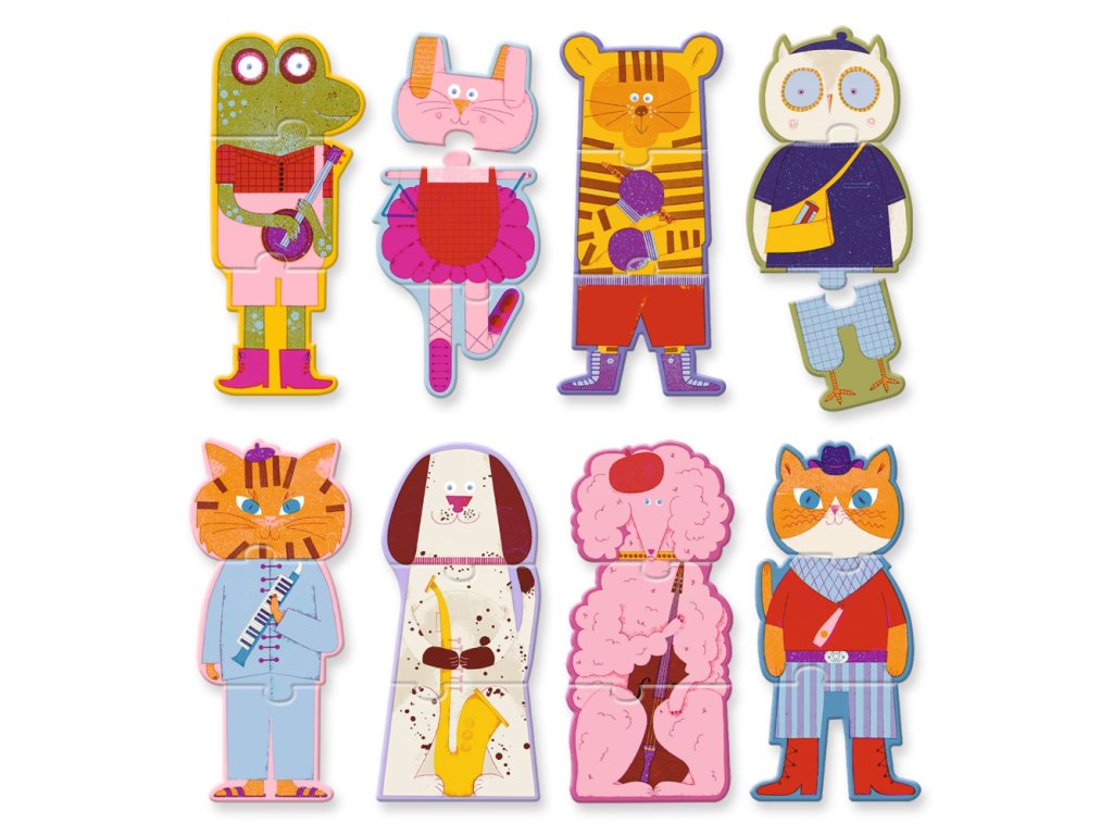 Puzzle Trio Orchester 8 ks Hudobné zvieratká v skladačke pre najmenších! Puzzle Trio Orchester je ideálne vzdelávacie puzzle pre deti od 3 rokov, ktoré spája zábavu s učením. V tejto originálnej verzii deti skladajú zvieratká – hudobníkov, a to vo vertikálnom poradí. Každé zviera je rozdelené na 3 dieliky, ktoré musia správne spojiť, aby vznikol celý člen orchestera. Puzzle podporuje rozvoj pozorovacích schopností, logického myslenia a jemnej motoriky. Navyše vďaka samoopravnému systému si deti samy overia, či dieliky sedia. Vyrobené z hrubého kartónu FSC®, ktorý je odolný a vhodný pre malé detské ručičky.Dodatočné parametre