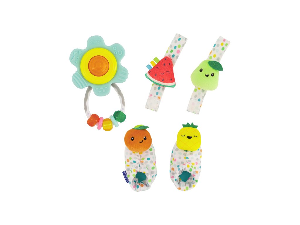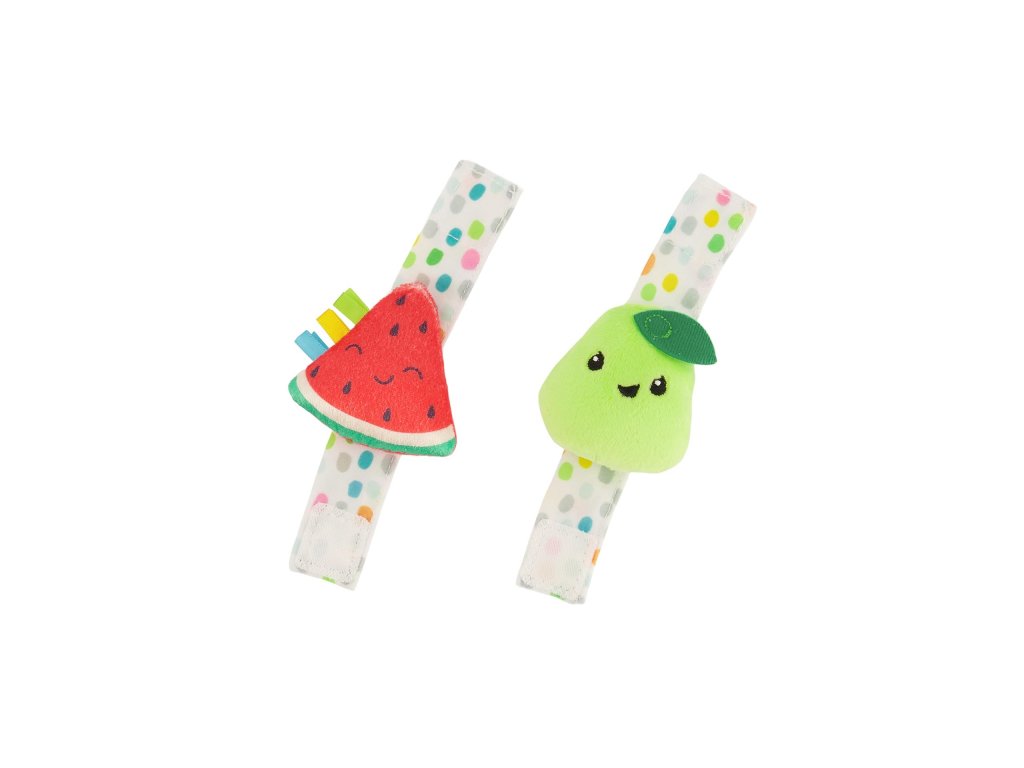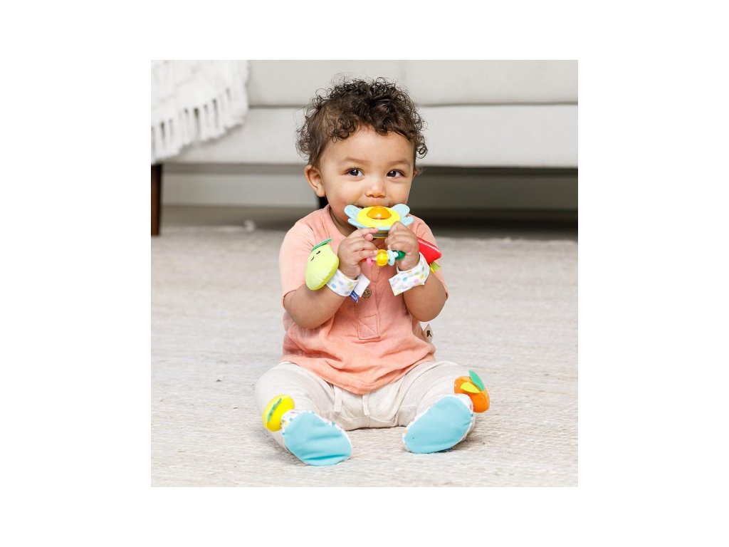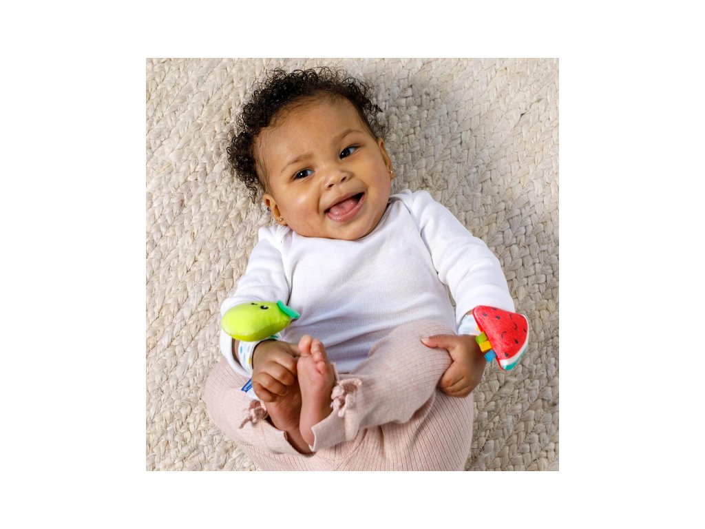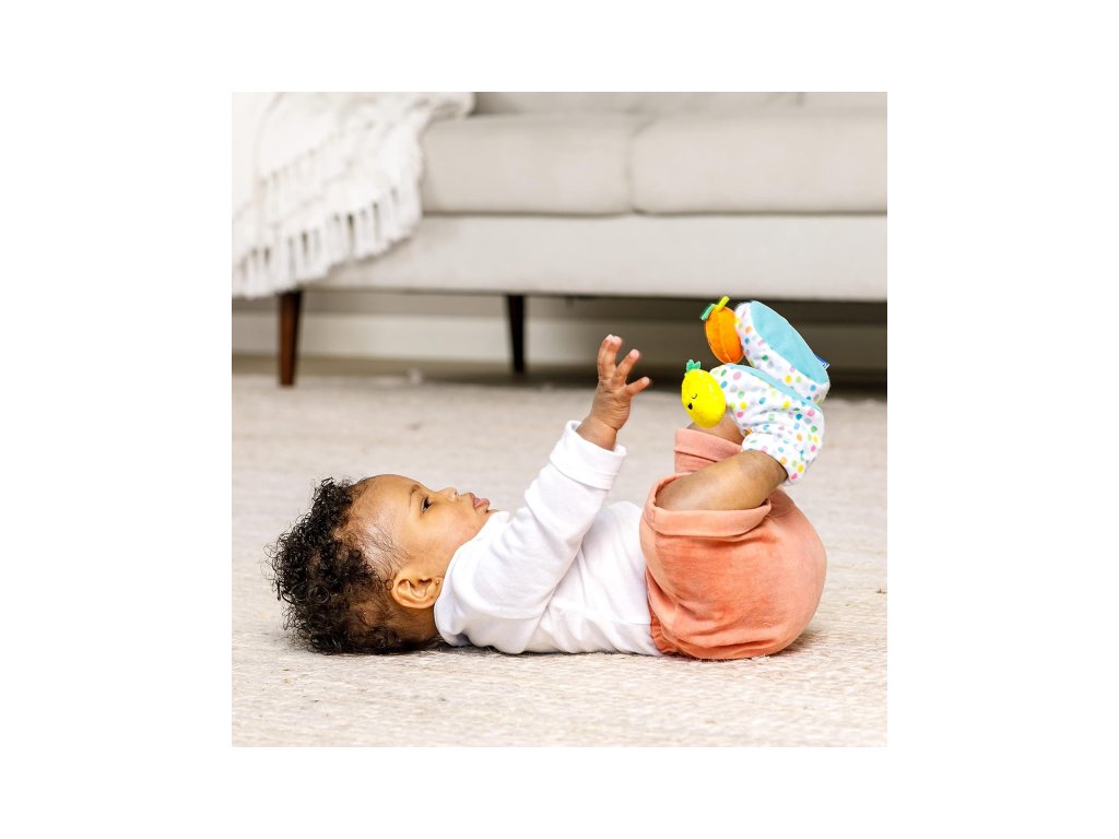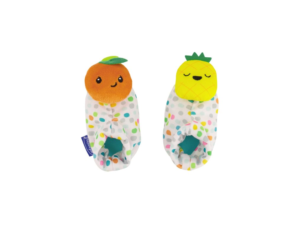 Navliekacie papučky na nožičky a hrkálky na ruky s veselými tvárami v tvare ovocia podnecujú rozvoj sluchu, zraku a hmatu dieťaťa. Dieťa pri kopaní nožičkami aj pri pohybe ručičkami sleduje a skúma pohybujúce výrazné farby hračky. Vďaka pripevneniu na nožičky či ruky vydrží dieťaťu hra dlhú dobu, pretože mu hračka nemôže spadnúť. Rôznorodé textúry na skúmanie pomáhajú rozvoju hmatu.
