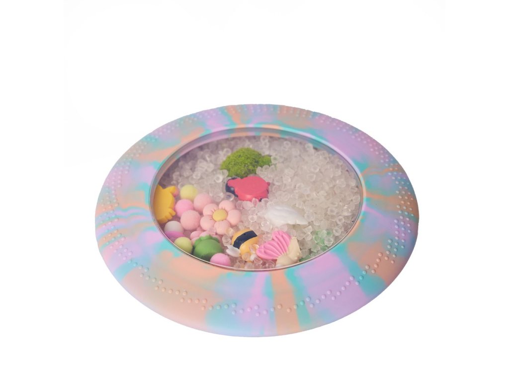 Mäkký silikónový disk s priehľadným okienkom ukrýva drobné nezávadné figúrky a guľôčky, ktoré môžu deti stláčať, tlačiť, posúvať, hľadať, naťahovať aj pátrať po skrytých pokladoch. Obľúbená hra „hľadaj a nájdi!“ tak dostáva nový rozmer a nikdy sa neomrzí. Hračka je ideálna pre malé ručičky, ktoré milujú stláčanie, objavovanie a skúmanie dotykom.