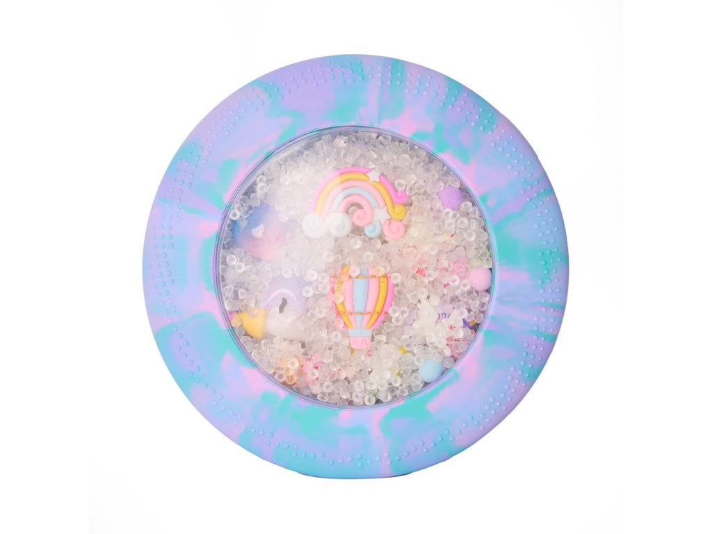 Mäkký silikónový disk s priehľadným okienkom ukrýva drobné nezávadné figúrky a guľôčky, ktoré môžu deti stláčať, tlačiť, posúvať, hľadať, naťahovať aj pátrať po skrytých pokladoch. Obľúbená hra „hľadaj a nájdi!“ tak dostáva nový rozmer a nikdy sa neomrzí. Hračka je ideálna pre malé ručičky, ktoré milujú stláčanie, objavovanie a skúmanie dotykom.