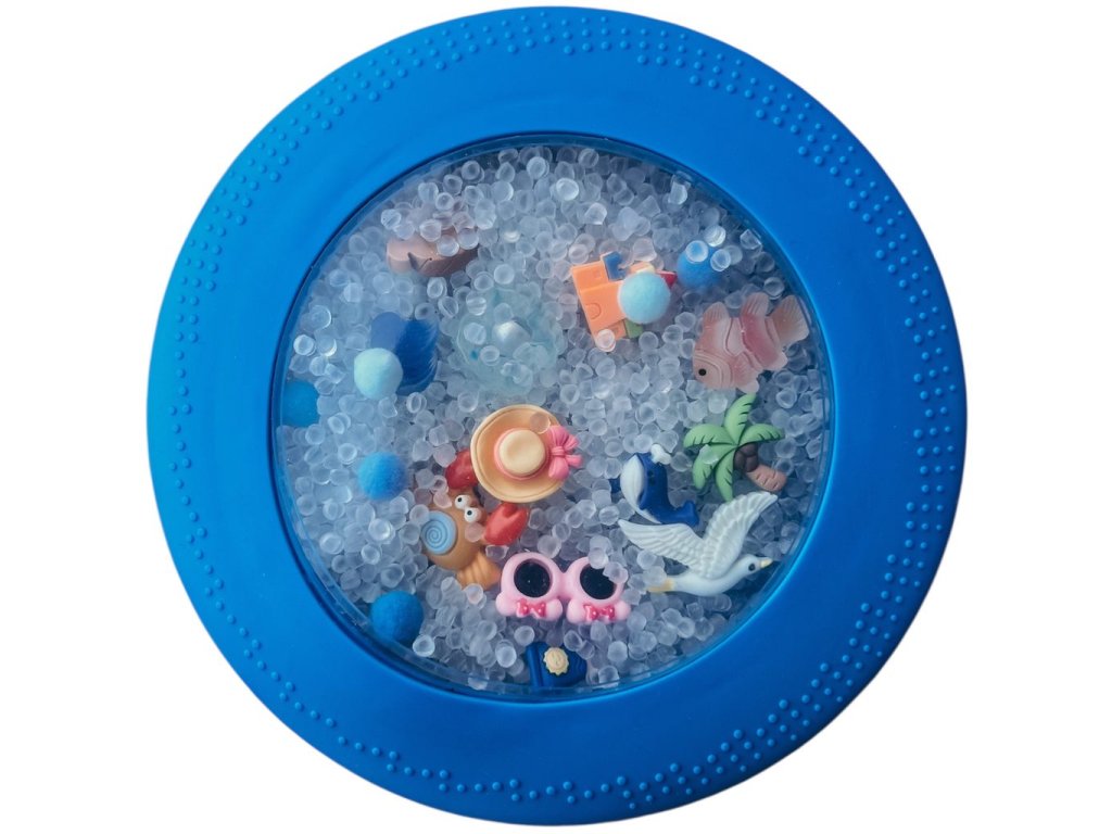 Mäkký silikónový disk s priehľadným okienkom ukrýva drobné nezávadné figúrky a guľôčky, ktoré môžu deti stláčať, tlačiť, posúvať, hľadať, naťahovať aj pátrať po skrytých pokladoch. Obľúbená hra „hľadaj a nájdi!“ tak dostáva nový rozmer a nikdy sa neomrzí. Hračka je ideálna pre malé ručičky, ktoré milujú stláčanie, objavovanie a skúmanie dotykom.