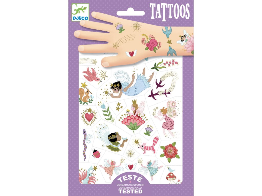 Tetovačky Víly 2 hárky dočasných tetovačiek s jemnými ilustráciami z láskavého sveta vílDeti navyše poteší zlatý metalický lesk. Jednotlivé tetovačky sa z hárkov ľahko vytrhávajú. Aplikácia: odstráňte fóliu, priložte tetovačku na kožu, navlhčite podkladový papier, jemne pritlačte, papier stiahnite. Po obnosení odstráňte mydlovou vodou alebo jemným odličovacím prípravkom. Tetovačky sú dermatologicky testované.Obsah: 50+ ks na 2 hárkoch, návod na použitieDodatočné parametre