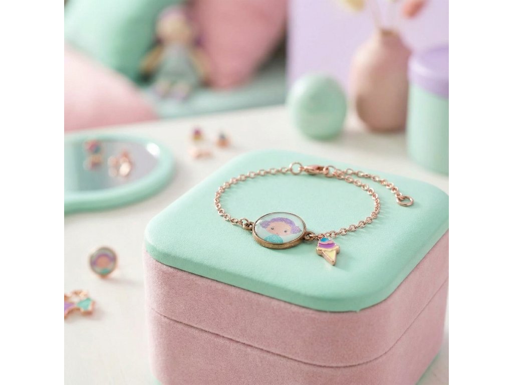 Tinyly náramok Tutti Zmrzlinový úsmev: Tinyly náramok Tutti na leto aj oslavyTinyly náramok Tutti je jemný detský náramok z kolekcie Tinyly. Na pozlátenej kovovej retiazke visí ilustrovaný medailónik s portrétom postavičky a k nemu ladiaca ozdôbka – prívesok v tvare kornútka so zmrzlinou.Sladký motív zmrzliny robí z náramku veselý doplnok – ideálny na leto, oslavy aj „len tak“ pre radosť. Vďaka nastaviteľnému zapínaniu sa dá veľkosť jednoducho prispôsobiť detskému zápästiu.Rýchly prehľad odporúčaný vek: od 4 rokov typ: detský náramok s medailónikom a príveskom materiál: kovová retiazka (pozlátený vzhľad), ilustrované prvky dĺžka retiazky: cca 18 cm veľkosť medailónika: Ø 13 mm balenie: darčekové kartónové puzdro s okienkomPrečo si ho deti zamilujú jemný šperk, ktorý pôsobí „dospelácky“, no stále hravo medailónik s postavičkou Tinyly – každý model má svoj príbeh praktické zapínanie – náramok sa dá prispôsobiť krásny tip na malý darček (oslava, odmena, „len tak“)Obsah balenia 1× náramok (kovová retiazka so zapínaním) 1× ilustrovaný medailónik 1× prívesok (prívesok v tvare kornútka so zmrzlinou)Technické parametre zapínanie: nastaviteľné (karabínka + očká) dĺžka retiazky: cca 18 cm medailónik: Ø 13 mm rozmery balenia: cca 9 × 9 × 0,2 cmDodatočné parametre