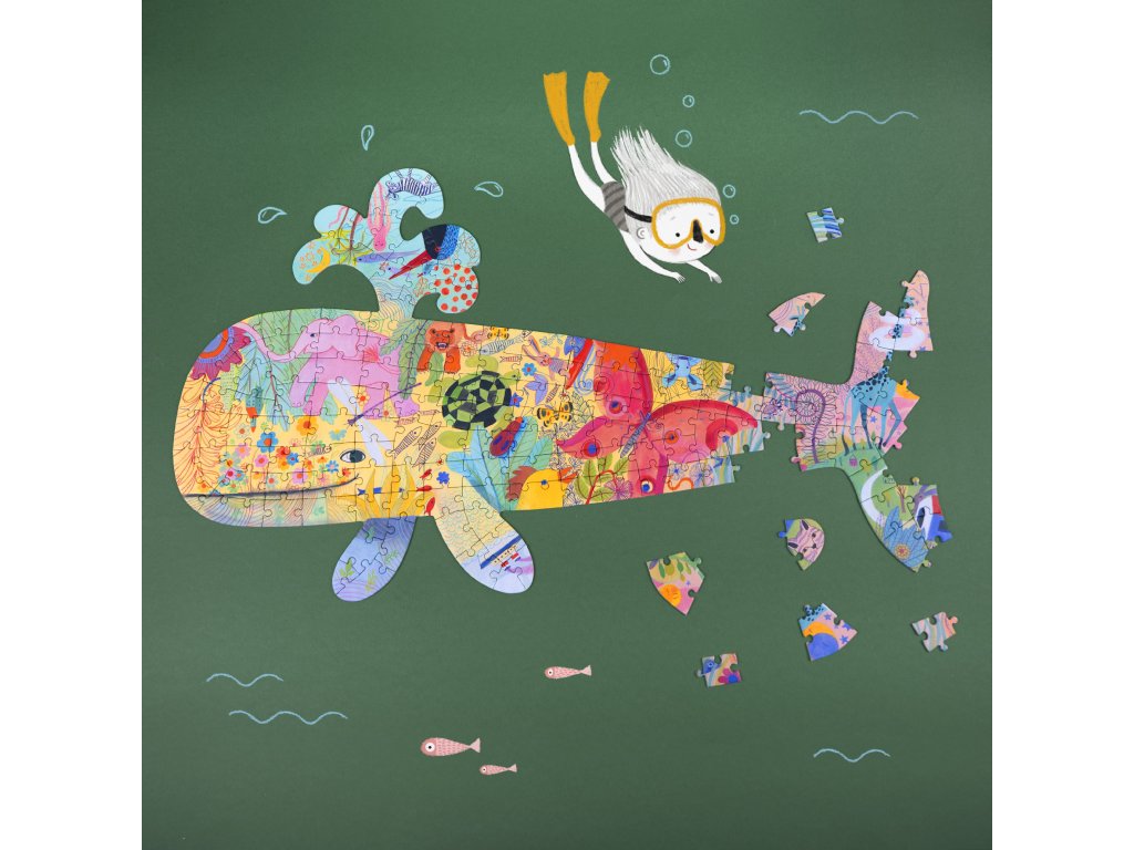 Umelecké puzzle Veľryba 150 ks Bez rohov a bez rámu: poskladaj veľrybu a objav farebný svet ukrytý v jej silueteUmelecké puzzle Veľryba je netradičné siluetové puzzle, ktoré deti (aj dospelých) prekvapí už na prvý pohľad.Nečakajú ťa klasické rovné okraje – skladáš veľký tvar veľryby s výrezmi, v ktorom sa ukrýva detailný fantazijný svet plný drobných scénok a tvorov.V balení je aj plagát, ktorý pomáha pri skladaní.Rýchly prehľad odporúčaný vek: od 6 rokov počet dielikov: 150 typ: siluetové puzzle bez rohov a bez okrajov rozvíja: sústredenie, trpezlivosť, zmysel pre detail, jemnú motoriku v balení: puzzle + plagát (predloha)Prečo si ho deti zamilujú je to iné než bežné puzzle – skladanie bez rámu je zábavná výzva ilustrácia je plná detailov, ktoré lákajú objavovať a rozprávať plagát uľahčí začiatok aj kontrolu postupu kvalitné spracovanie – puzzle sa dá skladať znova a znovaAko sa s tým hrá Rozlož plagát ako predlohu a dieliky otoč obrázkom nahor. Začni výraznými farbami a motívmi, potom dopĺňaj tvar siluety veľryby. Po zložení si prezrite detaily a skúste nájsť čo najviac „minipríbehov“ v obrázku.Obsah balenia 150× dielik puzzle 1× plagát (predloha)Technické parametre rozmer zloženého puzzle: 67 × 40 cm materiál: papier a kartón (FSC) vyrobené: v EurópeDodatočné parametre