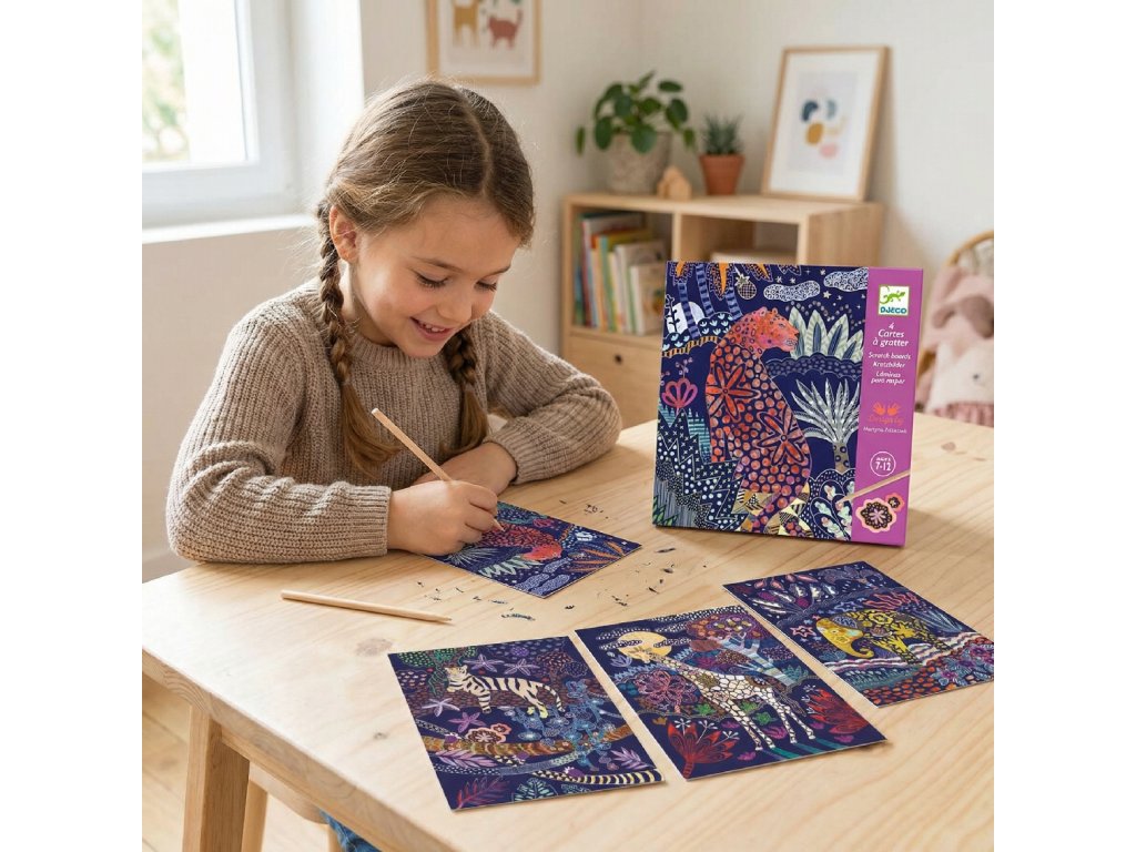 Vyškrabovacie obrázky Divoká Afrika Divoká Afrika pod povrchom: vyškrabuj vzory, odhaľ farby a vytvor 4 detailné zvieracie obrázkyVyškrabovacie obrázky Divoká Afrika sú kreatívna sada, v ktorej deti postupne odhaľujú skryté ilustrácie vyškrabovaním vrchnej vrstvy.Pomocou dreveného vyškrabávacieho pera kopírujú pripravené línie a vzory – a pod rukou sa objavujú farby a detaily africkej prírody.Každá kartička je malé prekvapenie: dieťa pracuje jemne a presne, skúša rôzne typy ťahov a postupne „vykresľuje“ srsť, listy aj ornamenty.Výsledkom sú 4 hotové obrázky s motívmi divokých zvierat, ktoré si môžete vystaviť alebo darovať.Rýchly prehľad odporúčaný vek: od 7 rokov rozvíja: jemnú motoriku, trpezlivosť, sústredenie, cit pre detail v balení: 4 vyškrabávacie kartičky, drevené pero, ilustrovaný návodPrečo si ich deti zamilujú „wow“ efekt – farby sa objavujú postupne pod povrchom jasný postup podľa návodu, no zároveň priestor na vlastné vzory tiché tvorenie, ktoré prirodzene podporuje sústredenie 4 hotové obrázky – skvelý pocit z dokončeného dielaAko to funguje Vyber si kartičku a polož ju na rovný povrch. Dreveným perom jemne vyškrabuj línie a plochy – podľa vzorov v návode. Striedaj krátke a dlhé ťahy, aby si vytvoril(a) textúry a detaily. Po dokončení obrázok jemne očisti od prachu z vyškrabovania.Obsah balenia 4× vyškrabávacia kartička s africkými motívmi 1× drevené vyškrabávacie pero 1× ilustrovaný návod krok za krokomTechnické parametre materiál: kartón/papier, drevo počet obrázkov: 4 rozmery balenia: cca 22 × 23 cmDodatočné parametre