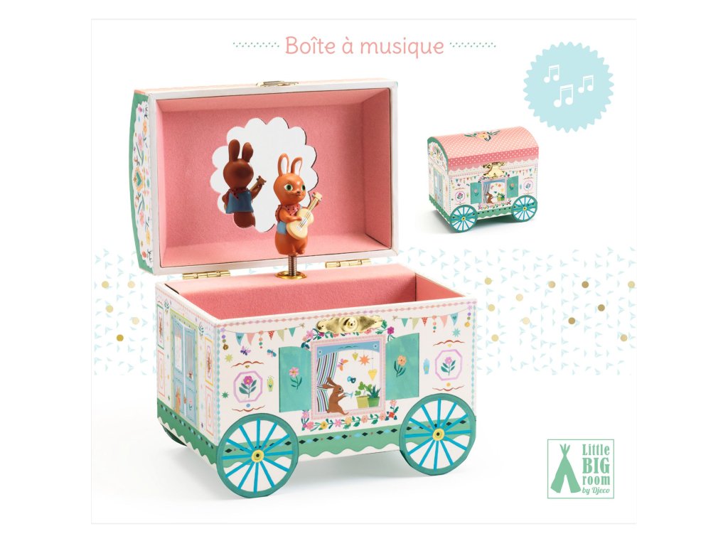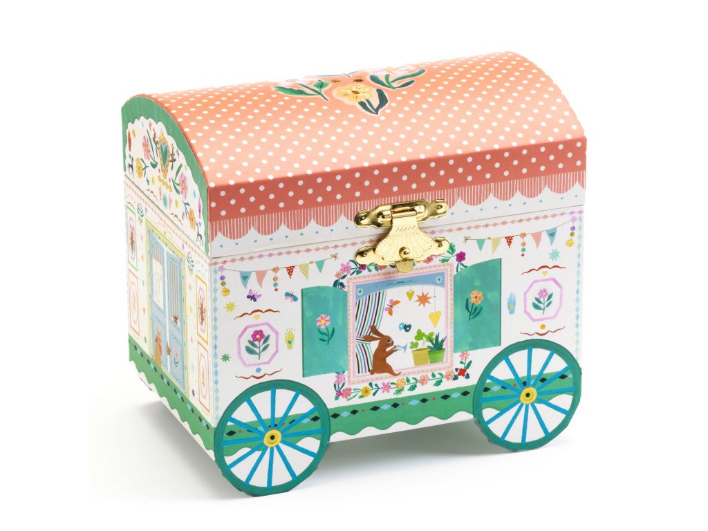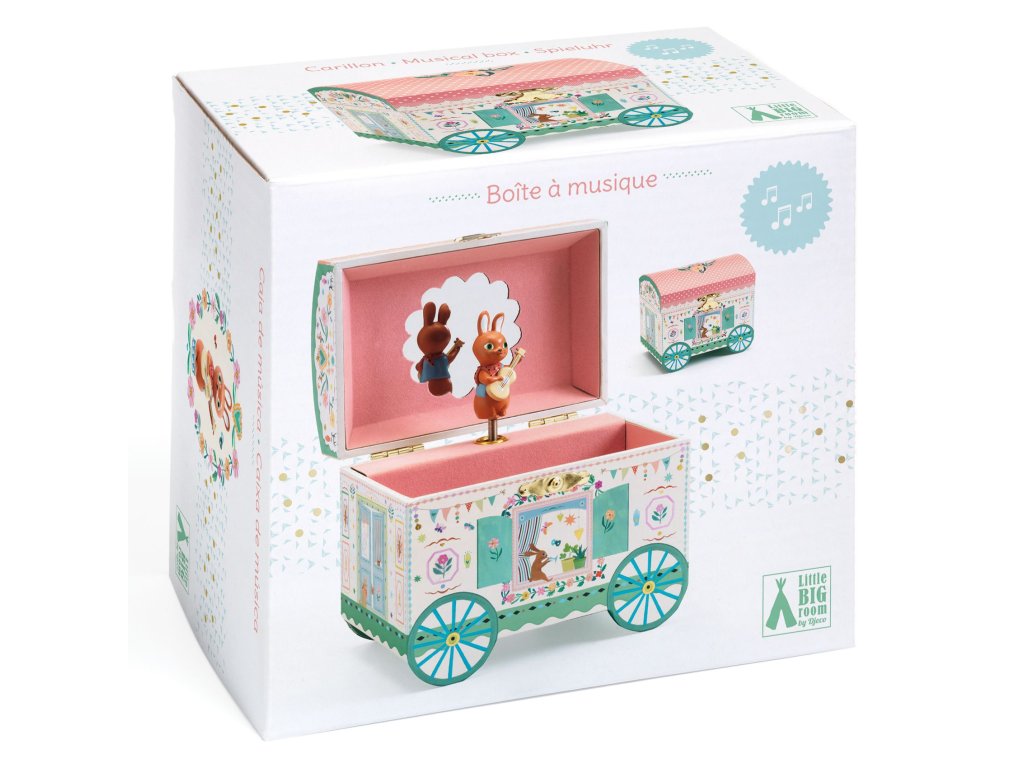 Začarovaný karavan: hracia skrinkaDrevená hudobná skrinka s otočnou figúrkou a úložným priestoromZačarovaný karavan – hracia skrinka je krásna drevená hudobná skrinka v tvare karavanu, ktorá hrá jemnú melódiu „Le temps des cerises“ (Antoine Ronzon) pri natiahnutí kľúčika a otvorení veka. Vo vnútri je zamatové vyloženie, zrkadielko v tvare kvetinky a roztomilá figúrka zajačika, ktorá sa pri hudbe otáča a vytvára kúzelnú atmosféru v detskej izbe. Skrinka zároveň slúži ako úložný priestor na drobné poklady alebo šperky.Prečo si vybrať hraciu skrinku od Djecojemná hudba pri natiahnutí kľúčika (asi 2 min 30 s)zamatový vnútorný priestor a dekoratívne zrkadielkofigúrka, ktorá sa otáča s hudboukrásny dekoratívny doplnok do detskej izby aj praktická šperkovnicaObsah baleniadrevená hudobná skrinka v tvare karavanuDodatočné parametre